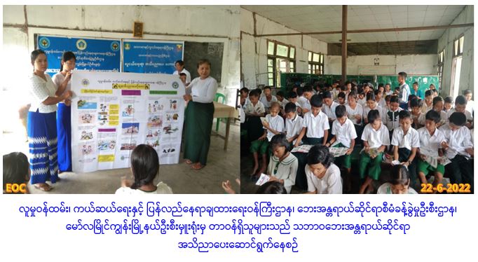 လူမှုဝန်ထမ်း၊ ကယ်ဆယ်ရေးနှင့် ပြန်လည်နေရာချထားရေဝန်ကြီးဌာန၊ ဘေးအန္တရာယ်ဆိုင်ရာစီမံခန့်ခွဲမှုဦးစီးဌာန၊ မော်လမြိုင်ကျွန်းမြို့နယ်ဦးစီးမှူးမှ တာဝန်ရှိသူများသည် မော်လမြိုင်ကျွန်းမြို့၊ အမှတ်(၈)ရပ်ကွက်၊ အ.မ.က(မူလွန်)ကျောင်း၊ တုံးလှဲရပ်တွင် ကျောင်းသား၊ ကျောင်းသူ(၁၃၀)ဦးခန့်တို့အား (၂၂.၆.၂၀၂၂)ရက်နေ့၊ မွန်းလွဲ (၁၄:၀၀)နာရီအချိန်မှ (၁၅:၀၀) နာရီအချိန်ထိ သဘာဝဘေးအသိပညာပေးဟောပြောဆောင်ရွက်ခဲ့ပြီး လက်ကမ်းစာစောင်နှင့် ဗီနိုင်းပိုစတာများ ပေးအပ်ခဲ့ပါကြောင်း သတင်းရရှိပါသည်။