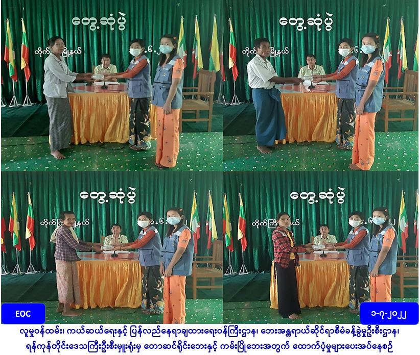 လူမှုဝန်ထမ်း၊ ကယ်ဆယ်ရေးနှင့် ပြန်လည်နေရာချထားရေးဝန်ကြီးဌာန၊ ဘေးအန္တရာယ်ဆိုင်ရာစီမံခန့်ခွဲမှုဦးစီးဌာန၊ ရန်ကုန်တိုင်းဒေသကြီး ဦးစီးမှူးရုံးမှ တာဝန်ရှိသူများသည် (၂၉-၅-၂၀၂၂) ရက်တွင် ရန်ကုန် မြောက်ပိုင်းခရိုင်၊ တိုက်ကြီးမြို့နယ်၊ ဖလုံဘူကျေးရွာအုပ်စု၊ သာယာအေးကျေးရွာတွင် တောဆင်ရိုင်းဝင်ရောက်မှုကြောင့် အိမ်ခြေ (၁)လုံးအတွက် အိမ်ဆောက်ပစ္စည်းဖိုးထောက်ပံ့ငွေ (၅၀,၀၀ဝ/-)ကျပ်၊ လူဦးရေ (၄) ဦးအတွက် ဆန်ရိက္ခာဖိုးထောက်ပံ့ငွေ (၈၄၀ဝ/-)ကျပ်အား လည်းကောင်း၊ (၂၃-၆-၂၀၂၂)ရက်တွင် ဖလုံဘူတာကျေးရွာအုပ်စု၊ အောင်ချမ်းသာကျေးရွာတွင် တောဆင်ရိုင်းဝင်ရောက်မှုကြောင့် အိမ်ခြေ (၁)လုံးအတွက် အိမ်ဆောက် ပစ္စည်းဖိုးထောက်ပံ့ငွေ (၅၀,၀၀ဝ/-)ကျပ်၊ လူဦးရေ (၅) ဦးအတွက် ဆန်ရိက္ခာဖိုးထောက်ပံ့ငွေ (၁၀၅၀ဝ/-)ကျပ် အားလည်းကောင်း၊ (၂၉-၆-၂၀၂၂) ရက်တွင် ဖလုံဘူတာကျေးရွာအုပ်စု၊ ရွှေမြိုင်သာယာအေးကျေးရွာတွင် တောဆင်ရိုင်းဝင်ရောက်မှုကြောင့် အိမ်ခြေ (၁)လုံးအတွက် အိမ်ဆောက်ပစ္စည်းဖိုးထောက်ပံ့ငွေ (၃၀,၀၀ဝ/-)ကျပ်၊ လူဦးရေ(၇)ဦးအတွက် ဆန်ရိက္ခာဖိုးထောက်ပံ့ငွေ (၁၄၇၀ဝ/-) ကျပ်အားလည်းကောင်း၊ (၁၇-၆-၂၀၂၂) ရက်တွင် အဖျောက်မြို့၊ ရေပေါ်သောင်ကျေးရွာအုပ်စု၊ ရေပြန်အလယ် သောင်ကျေးရွာတွင် ကမ်းပြိုပိသေဆုံး (၁) ဦးအတွက် သေဆုံး ထောက်ပံ့ငွေ (၃၀၀၀၀ဝ/-)ကျပ်အားလည်းကောင်း၊ (၂၉-၆-၂၀၂၂)ရက် တွင် အဖျောက်မြို့၊ အုန်းပင်ကွင်းကျေးရွာအတွင်း မြစ်ကမ်းပါးပြိုကျမှု အန္တရာယ်ကြောင့် ကြိုတင်ပြောင်းရွှေ့နေအိမ် (၂)လုံးအတွက် ကြိုတင် ဖျက်သိမ်းထောက်ပံ့ငွေ (၂၀၀၀၀ဝ/-)ကျပ်၊ လူဦးရေ (၈)ဦးအတွက် ဆန်ရိက္ခာဖိုးထောက်ပံ့ငွေ (၁၆၈၀ဝ/-) ကျပ်အားလည်းကောင်း (၁-၇-၂၀၂၂) ရက်၊ (၁၃း၀၀)နာရီအချိန်တွင် တိုက်ကြီးမြို့နယ် အထွေထွေအုပ်ချုပ်ရေးဦးစီးဌာနမှ တာဝန်ရှိသူများနှင့်အတူ ပြည်သူ များ၏ လက်ဝယ်အရောက် ထောက်ပံ့ပေးအပ်ခဲ့ပါကြောင်း သတင်း ရရှိပါသည်။