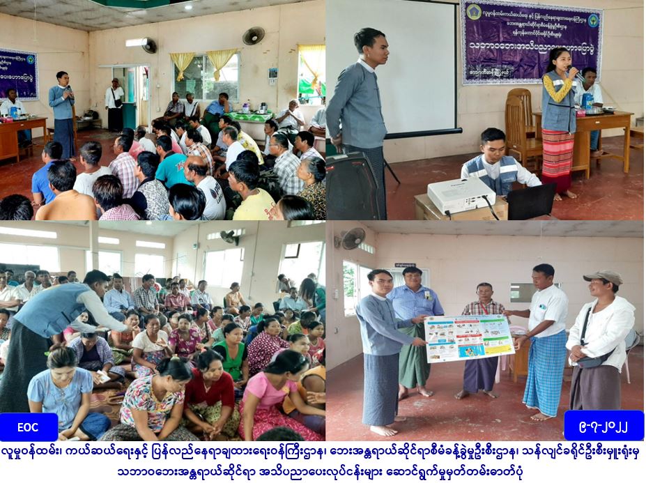 လူမှုဝန်ထမ်း၊ ကယ်ဆယ်ရေးနှင့်ပြန်လည်နေရာချထားရေးဝန်ကြီးဌာန၊ ဘေးအန္တရာယ်ဆိုင်ရာစီမံခန့်ခွဲမှုဦးစီးဌာန၊ သန်လျင်ခရိုင်ဦးစီးမှူးရုံးမှ တာဝန်ရှိသူများသည် သန်လျင်ခရိုင်၊ ကျောက်တန်းမြို့နယ်၊ ချောင်းဝ ကျေးရွာအုပ်စု၊ ချောင်း၀ကျေးရွာ၊ ကျေးရွာအုပ်ချုပ်ရေးမှူးရုံးတွင် ကျေး ရွာသူ/ရွာသား ဦးရေ (၁၂၀) ကျော်အား ဦးစီးဌာန၏လုပ်ငန်း တာဝန်များ၊ ဆောင်ရွက်ချက်များနှင့် သဘာဝဘေးအန္တရာယ်ဆိုင်ရာ အကြောင်း သိကောင်းစရာများနှင့်ပတ်သက်၍ ဆွေးနွေးဟောပြောခြင်း၊ လက်ကမ်းစာစောင်များ ဖြန့်ဝေခြင်းနှင့် ပိုစတာများအား ကျေးရွာ အုပ်ချုပ်ရေးမှူးထံသို့ပေးအပ်ခြင်းများကို (၉-၇-၂၀၂၂) ရက်နေ့ နံနက် (၁၀:၀၀) အချိန်မှ (၁၂:၀၀) အချိန်အတွင်း ဆောင်ရွက်ခဲ့ပါကြောင်း သတင်းရရှိပါသည်။