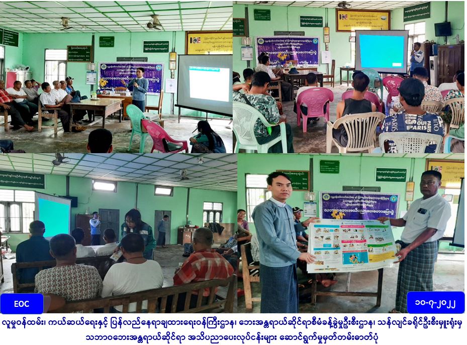 လူမှုဝန်ထမ်း၊ ကယ်ဆယ်ရေးနှင့်ပြန်လည်နေရာချထားရေးဝန်ကြီးဌာန၊ ဘေးအန္တရာယ်ဆိုင်ရာစီမံခန့်ခွဲမှုဦးစီးဌာန၊ သန်လျင်ခရိုင်ဦးစီးမှူးရုံးမှ တာဝန်ရှိသူများသည် (၁၀-၇-၂၀၂၂) ရက်နေ့ နံနက် (၁၀:၀၀) အချိန်မှ (၁၂:၀၀) အချိန်အထိ သန်လျင်ခရိုင်၊ ကျောက်တန်းမြို့နယ်၊ ခလောက် ဆွဲကျေးရွာအုပ်စု၊ မီးပြကျေးရွာ၊ ကျေးရွာအုပ်ချုပ်ရေးမှူးရုံးတွင် ကျေးရွာသူ/ရွာသားဦးရေ (၈၀) ဦးခန့်အား ဦးစီးဌာန၏လုပ်ငန်း တာဝန်များ၊ ဆောင်ရွက်ချက်များနှင့် သဘာဝဘေးအန္တရာယ်ဆိုင်ရာ အကြောင်း သိကောင်းစရာ များနှင့်ပတ်သက်၍ ဆွေးနွေးဟောပြောပြီး လက်ကမ်းစာစောင်များဖြန့်ဝေပေးခြင်းနှင့် ပိုစတာများအား ကျေးရွာ အုပ်ချုပ်ရေးမှူးထံသို့ပေးအပ်ခြင်းများ ဆောင်ရွက်ခဲ့ပါကြောင်း သတင်း ရရှိပါသည်။