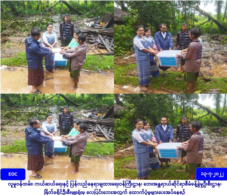 လူမှုဝန်ထမ်း၊ ကယ်ဆယ်ရေးနှင့်ပြန်လည်နေရာချထားရေးဝန်ကြီးဌာန၊ ဘေးအန္တရာယ်ဆိုင်ရာစီမံခန့်ခွဲမှုဦးစီးဌာန၊ မြိတ်ခရိုင်ဦးစီးမှူးရုံးမှ တာဝန်ရှိသူများသည် (၁၂.၇.၂၀၂၂) ရက်နေ့တွင် မြိတ်မြို့နယ်၊ ကဟန်း ကျေးရွာအုပ်စု၊ ကဟန်းကျေးရွာတွင် ဖြစ်ပွားခဲ့သော လေဘေး၌ မိုးသည်းထန်စွာရွာသွန်းပြီး လေပြင်းတိုက်ခတ်မှုကြောင့် လေဘေးသင့် လုံးဝပျက်စီးနေအိမ် (၁)လုံးအတွက် အိမ်ဆောက်ပစ္စည်းဖိုး (၁၀၀,၀၀ဝ/-) ကျပ်၊ ဘေးသင့်အိမ်ထောင်စု(၁)စုမှ လူဦးရေ (၉)ဦး အတွက် (၇)ရက်စာဆန်ရိက္ခာဖိုး (၁၈,၉၀ဝ/-)ကျပ်၊ စုစုပေါင်း ထောက်ပံ့ငွေ (၁၁၈,၉၀၀/-)ကျပ်၊ လေဘေးသင့်အိမ်ထောင်စု (၁) စုအတွက် (၄၆၀၃၆/-) ကျပ် တန်ဖိုးရှိ ကယ်ဆယ်ရေးပစ္စည်း (၁၇)မျိုး(၁)ပုံး၊ အ.မ.က ကျောင်းသား(၁)ဦးနှင့် ကျောင်းသူ (၁)ဦး အတွက် ကျောင်းဝတ်စုံ ကျား/မ (၂)စုံ တို့အား မြို့နယ် စီမံအုပ်ချုပ် ရေးအဖွဲ့မှ အဖွဲ့ဝင်နှင့်အတူ (၁၃.၇.၂၀၂၂) ရက်နေ့ (၁၅း၀၀)နာရီ အချိန်တွင် သွားရောက်ထောက်ပံ့ပေးအပ်ခဲ့ပါကြောင်း သတင်းရရှိပါ သည်။