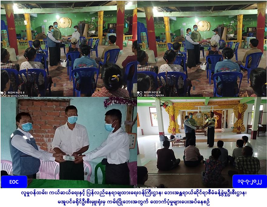 လူမှုဝန်ထမ်း၊ ကယ်ဆယ်ရေးနှင့်ပြန်လည်နေရာချထားရေးဝန်ကြီးဌာန၊ ဘေးအန္တရာယ်ဆိုင်ရာစီမံခန့်ခွဲမှုဦးစီးဌာန၊ မအူပင်ခရိုင်ဦးစီးမှူးရုံးမှ တာဝန်ရှိသူများသည် ဧရာဝတီတိုင်းဒေသကြီး၊ မအူပင်ခရိုင်၊ ပန်းတနော်မြို့နယ်၊ ဘဝိုင်းကျေးရွာအုပ်စု၊ မြင်းကဒေါင် ကျေးရွာ၊ ရေပေါ်ကြီးကျေးရွာအုပ်စု၊ (အထက်ကဇင်းတော၊ ကုလားမချောင်)ရွာ နှင့် တောကျောင်းကျေးရွာအုပ်စု၊ (ကျောင်းတော် ကလေး၊ နံဂါတ်ရိုးနှင့် နံဂါတ်)ကျေးရွာတို့၌ (၁၂-၇-၂၀၂၂) ရက်မှ (၁၃-၇-၂၀၂၂)ရက်တွင် ဖြစ်ပွားခဲ့သော ကမ်းပြိုဘေးကြောင့် ကြိုတင်ဖျက်သိမ်း ပြောင်းရွှေ့ ခဲ့သည့် ဘာသာရေးကျောင်း (၁)ကျောင်းနှင့် နေအိမ် (၂၈)လုံး၊ အိမ်ထောင်စု (၂၈)စုမှ လူဦးရေ (၁၃၁) ဦးအတွက် ဆန်ရိက္ခာ (၇)ရက် စာဖိုး ရန်ပုံငွေ(၂၇၅,၁၀ဝ/-)၊ အိမ်/ ကျောင်းဆောက်ပစ္စည်းဖိုး ရန်ပုံငွေ (၂,၉၀၀,၀၀ဝ/-)၊ စုစုပေါင်း ကယ်ဆယ်ရေးရန်ပုံငွေ (၃,၁၇၅,၁၀ဝ/-) နှင့် ကာဘော်လိပ်ဆပ်ပြာ (၂၉) တောင့်တို့အား (၁၃-၇-၂၀၂၂)ရက်နေ့၊ (၁၃:၃၀)၊ (၁၄:၃၀)၊ (၁၅:၃၀) နာရီအချိန်တို့တွင် ပန်းတနော်မြို့နယ် စီမံအုပ်ချုပ်ရေးအဖွဲ့မှ တာဝန်ရှိသူများနှင့်အတူ ကမ်းပြိုဘေးသင့် ပြည်သူများ၏ လက်ဝယ်အရောက် ကွင်းဆင်းထောက်ပံ့ပေးအပ်ခဲ့ပါ ကြောင်း သတင်းရရှိပါသည်။