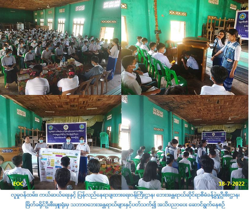 လူမှုဝန်ထမ်း၊ ကယ်ဆယ်ရေးနှင့် ပြန်လည်နေရာချထားရေးဝန်ကြီးဌာန၊ ဘေးအန္တရာယ်ဆိုင်ရာစီမံခန့်ခွဲမှုဦးစီးဌာန၊ မြိတ်ခရိုင်ဦးစီမှူးရုံးမှ တာဝန်ရှိသူများသည် (၁၈-၇-၂၀၂၂) ရက်နေ့ နံနက် (၁၃:၃၀)အချိန်တွင် မြိတ်မြို့နယ်၊ သမုတ်ကျေးရွာရှိ အ.ထ.က (သမုတ်) အခြေခံပညာအထက်တန်းကျောင်းတွင် ဗဟုသုတများရရှိစေရန်ရည်ရွယ်၍ သဘာဝဘေးအန္တရာယ်များနှင့်ပတ်သက်၍ အသိပညာပေးဟောပြောပွဲဆောင်ရွက်ခဲ့ပြီး အဆိုပါ ဟောပြောပွဲသို့ ကျောင်းသားဦးရေ(၁၁၂)ဦးတက်ရောက်ခဲ့၍ သဏ္ဍာတူ သရုပ်ပြများဆောင်ရွက် ခြင်းလည်းကောင်း၊ လက်ကမ်းစာစောင်များ၊ ဗီနိုင်းနှင့် ဘောလ်ပင်များ ဝေငှပေးခြင်းတို့အား ဆောင်ရွက်ခဲ့ပါကြောင်း သတင်းရရှိပါသည်။