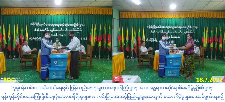လူမှု၀န်ထမ်း၊ ကယ်ဆယ်ရေးနှင့်ပြန်လည်နေရာချထားရေး၀န်ကြီးဌာန၊ ဘေးအန္တရာယ်ဆိုင်ရာစီမံခန့်ခွဲမှုဦးစီးဌာန၊ ရန်ကုန်တိုင်းဒေသကြီးဦးစီးမှူးရုံးမှတာဝန်ရှိသူများသည် (၈-၇-၂၀၂၂) ရက်နေ့တွင် တိုက်ကြီးခရိုင်၊ တိုက်ကြီးမြို့နယ်၊ အုန်းပင်ကွင်းကျေးရွာအုပ်စု၊ ရေပြန်ရွာသစ် ကျေးရွာ၌ မြစ်ကမ်းပါးပြိုကျမှုကြောင့် ပြောင်းရွှေ့အိမ်ခြေ(၂)လုံးအတွက် အိမ်ဆောက်ပစ္စည်းဖိုး ထောက်ပံ့ငွေ(၂၀၀,၀၀ဝ/-)ကျပ်၊ ဘေးသင့်လူဦးရေ(၅)ဦးအတွက် ဆန်ရိက္ခာဖိုးထောက်ပံ့ငွေ (၁၀,၅၀ဝ/-)ကျပ်အားလည်းကောင်း၊ (၁၂-၇-၂၀၂၂)ရက်နေ့တွင် အဖျောက်မြို့၊ အုန်းပင်ကွင်း ကျေးရွာအုပ်စု၊ ရေပြန်အရှေ့ကျေးရွာ၌ မြစ်ကမ်းပါးပြိုကျမှုကြောင့် ပြောင်းရွှေ့အိမ်ခြေ(၂)လုံးအတွက် အိမ်ဆောက်ပစ္စည်းဖိုးထောက်ပံ့ငွေ(၂၀၀,၀၀ဝ/-)ကျပ်၊ လူဦးရေ(၈)ဦး အတွက် ဆန်ရိက္ခာဖိုးထောက်ပံ့ငွေ(၁၆,၈၀ဝ/-)ကျပ်နှင့် ကယ်ဆယ်ရေးပစ္စည်း (၁၇)မျိုးတို့အား (၁၈-၇-၂၀၂၂) ရက်နေ့ (၁၃း၀၀)နာရီအချိန်တွင် တိုက်ကြီးမြို့နယ်အထွေထွေအုပ်ချုပ်ရေးဦးစီးဌာနမှ တာဝန်ရှိသူများနှင့်အတူ ဘေးသင့်ပြည်သူများ၏ လက်ဝယ်အရောက် ထောက်ပံ့ပေးအပ်ခဲ့ပါကြောင်း သတင်းရရှိပါသည်။