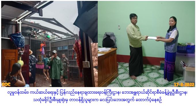 လူမှုဝန်ထမ်း၊ ကယ်ဆယ်ရေးနှင့် ပြန်လည်နေရာချထားရေးဝန်ကြီးဌာန၊ ဘေးအန္တရာယ်ဆိုင်ရာစီမံခန့်ခွဲမှုဦးစီးဌာန၊ သထုံခရိုင်ဦးစီးမှူးရုံးမှ တာဝန်ရှိသူများသည် (၁၆-၈-၂၀၂၂) ရက်နေ့(၁၄း၃၀)နာရီ အချိန်ခန့်၌ ပေါင်မြို့နယ်၊ ဝဲပတန်ကျေးရွာအုပ်စု၌ လေပြင်းတိုက်ခတ်မှုကြောင့် အမိုးလန်ပျက်စီးခဲ့သည့် လူနေအိမ်(၁၀)လုံးအတွက် အိမ်ဆောက်ပစ္စည်းဖိုးထောက်ပံ့ငွေ (၃၀၀၀၀၀/-)နှင့် လူဦးရေ(၃၉)ဦးအတွက် (၇)ရက်စာဆန်ရိက္ခာဖိုးထောက်ပံ့ငွေ( ၈၁၉၀၀/-) စုစုပေါင်းထောက်ပံ့ငွေ (၃၈၁၉၀၀/-)အား (၁၇-၈-၂၀၂၂)ရက်နေ့ (၁၃:၀၀) နာရီအချိန်ခန့်တွင် ပေါင်မြို့နယ် စီမံအုပ်ချုပ်ရေးအဖွဲ့နှင့်အတူ သွားရောက်ထောက်ပံ့ခဲ့ပါကြောင်း သတင်းရရှိပါသည်။