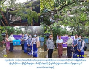 လူမှုဝန်ထမ်း၊ ကယ်ဆယ်ရေးနှင့် ပြန်လည်နေရာချထားရေး ဝန်ကြီးဌာန၊ ဘေးအန္တရာယ်ဆိုင်ရာစီမံခန့်ခွဲမှု ဦးစီးဌာန၊ ရန်ကုန်တိုင်းဒေသကြီး ဦးစီးမှူးရုံးမှတာဝန်ရှိသူများသည် (၁၇-၈-၂၀၂၂) ရက်နေ့ မိုးသည်းထန်စွာရွာသွမ်းမှုကြောင့် ရေကြီးရေလျှံမှုဖြစ်ပွားခဲ့ရာ မင်္ဂလာဒုံခရိုင်၊ ရွှေပြည်သာမြို့နယ်၊ အမှတ်(၁၄)ရပ်ကွက်၊ ဖိုးရာဇာလမ်းတွင် မိုးသည်းထန်စွာရွာသွန်းပြီးသစ်ပင်များပြိုလဲမှုကြောင့် လုံးဝပျက်စီးနေအိမ်(၁)လုံး၊ တစ်စိတ်တစ်ပိုင်နေအိမ်(၂)လုံး၊ စုစုပေါင်းနေအိမ်(၃)လုံး၊ အိမ်ထောင်စု(၃)စုအတွက် ဆန်ရိက္ခာဖိုးထောက်ပံ့ငွေ(၃၅,၇ဝဝ)ကျပ်၊ အိမ်ဆောက်ပစ္စည်းဖိုးထောက်ပံ့ငွေ(၃၀၀,၀၀ဝ)ကျပ်နှင့် ကယ်ဆယ်ပစ္စည်း(၁၇)မျိုးပါ(၁)ပုံးတို့အား (၁၈-၈-၂၀၂၂) ရက်နေ့တွင် ရွှေပြည်သာမြို့နယ်အထွေထွေအုပ်ချုပ်ရေးဦးစီးဌာနမှ တာဝန်ရှိသူများနှင့်အတူ ပြည်သူများ၏ လက်ဝယ်အရောက် ထောက်ပံ့ပေးအပ်ခဲ့ပါကြောင်း သတင်းရရှိပါသည်။