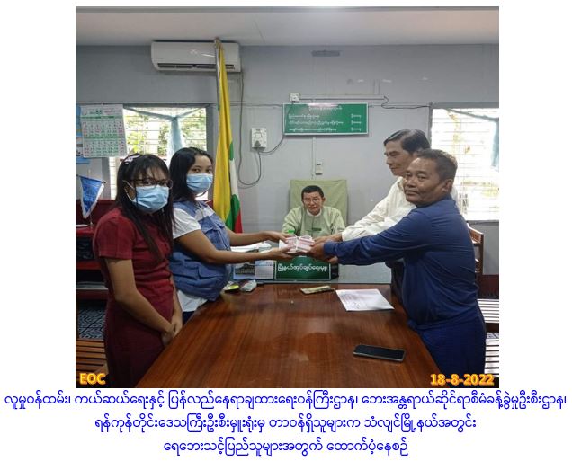 လူမှုဝန်ထမ်း၊ကယ်ဆယ်ရေးနှင့် ပြန်လည်နေရာချထားရေးဝန်ကြီးဌာန၊ ဘေးအန္တရာယ်ဆိုင်ရာစီမံခန့်ခွဲမှု ဦးစီးဌာန၊ ရန်ကုန်တောင်ပိုင်းခရိုင်ဦးစီးမှူးရုံး(သန်လျင်)မှ တာဝန်ရှိသူများသည်(၁၇-၈-၂၀၂၂) ရက်နေ့တွင် သန်လျင်ခရိုင်၊ သန်လျင်မြို့နယ်၊ ဗိုလ်ချုပ်ကျေးရွာ၊ အေးသာယာရပ်ကွက်၊ နယ်မြေ(၁၂)တွင် မိုးသည်းထန်စွာရွာသွန်းပြီး ရေကြီးရေလျှံမှုဖြစ်ပွားခဲ့ရာ အိမ်ထောင်စု (၁၀၇)စု၊ လူဦးရေ(၃၃၄)ဦးတို့အတွက် ဆန်ရိက္ခာဖိုး(၇)ရက်စာ စုစုပေါင်းထောက်ပံ့ငွေ(၇၀၁၄၀ဝိ/-)ကျပ် တိတိအား (၁၈-၈-၂၀၂၂)ရက်နေ့တွင် သန်လျင်မြို့နယ်အထွေထွေအုပ်ချုပ်ရေးဦးစီးဌာနမှ တာဝန်ရှိသူများနှင့်အတူ ဘေးသင့်ပြည်သူများ၏ လက်ဝယ်အရောက် ထောက်ပံ့ပေးအပ်ခဲ့ပါကြောင်း သတင်းရရှိပါသည်။