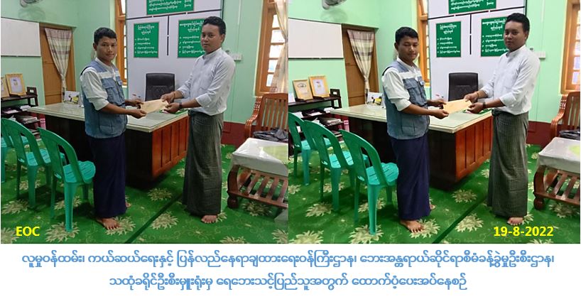 လူမှုဝန်ထမ်း၊ ကယ်ဆယ်ရေးနှင့် ပြန်လည်နေရာချထားရေးဝန်ကြီးဌာန၊ ဘေးအန္တရာယ်ဆိုင်ရာစီမံခန့်ခွဲမှုဦးစီးဌာန၊ သထုံခရိုင်ဦးစီးမှူးရုံးမှ တာဝန်ရှိသူများသည် (၁၈-၈-၂၀၂၂) ရက်နေ့(၁၂:၀၀)နာရီအချိန်ခန့်တွင် ပေါင်မြို့နယ်၊ လက်ပံကျွန်းကျေးရွာအုပ်စု၊ ကုလားစုကျေးရွာတွင် ရေတိုက်စားပြီး ကမ်းပါးပြိုကျမှုကြောင့် ကြိုတင်ဖျက်သိမ်း ပြောင်းရွှေ့ခဲ့သည့်လူနေအိမ်(၁)လုံးအတွက် အိမ်ဆောက်ပစ္စည်းဖိုးငွေ(၁၀၀,၀၀ဝ)ကျပ်နှင့် လူဦးရေ စုစုပေါင်း(၉)ဦးတို့အတွက် (၇)ရက်စာဆန် ရိက္ခာဖိုးထောက်ပံ့ငွေ (၁၈,၉၀ဝ) ကျပ်၊ စုစုပေါင်းထောက်ပံ့ငွေ(၁၁၈,၉၀၀)ကျပ်အား (၁၉-၈-၂၀၂၂) ရက်နေ့ (၁၁:၀၀) နာရီအချိန်ခန့်တွင် ပေါင်မြို့နယ်စီမံအုပ်ချုပ်ရေးအဖွဲ့ရုံး၌ သွားရောက် ထောက်ပံ့ပေးအပ်ခဲ့ပါကြောင်း သတင်းရရှိပါသည်။