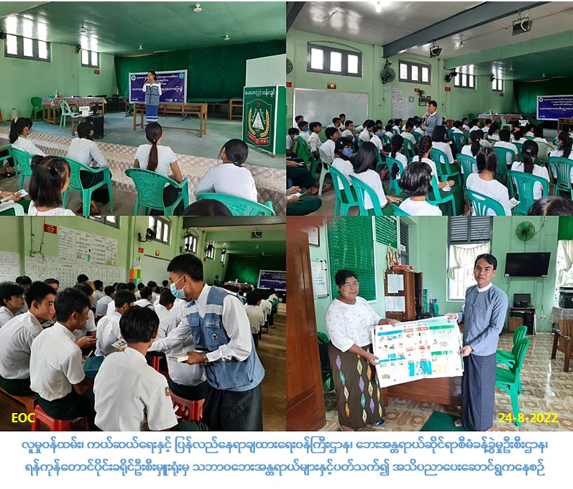 လူမှုဝန်ထမ်း၊ ကယ်ဆယ်ရေးနှင့် ပြန်လည်နေရာချထားရေးဝန်ကြီးဌာန၊ ဘေးအန္တရာယ်ဆိုင်ရာစီမံခန့်ခွဲမှုဦးစီးဌာန၊ ရန်ကုန်တောင်းပိုင်းခရိုင်ဦးစီးမှူးရုံး(သန်လျင်)မှ တာဝန်ရှိသူများသည် (၂၄-၈-၂၀၂၂)ရက်နေ့တွင် ရန်ကုန်တိုင်းဒေသကြီး၊ သန်လျင်ခရိုင်၊ သန်လျင်မြို့နယ်၊ အမှတ်(၃) ခြေခံပညာအထက်တန်းကျောင်းတွင် နံနက် (၁၀:၀၀) အချိန်မှ (၁၂:၀၀) အချိန်အထိ ဌာန၏လုပ်ငန်းတာဝန်များ၊ ဆောင်ရွက်ချက်များ၊ သဘာဝဘေးအန္တရာယ်ဆိုင်ရာအကြောင်း သိကောင်းစရာများနှင့်ပတ်သက်၍ ကျောင်းသား၊ ကျောင်းသူ ဦးရေ (၁၅၀)ဦးအား ဆွေးနွေးဟောပြောခြင်း၊ တာဝန်ရှိဝန်ထမ်းများမှ ဘေးအန္တရာယ်ဆိုင်ရာတစ်မျိုးချင်းစီအလိုက် အသိပညာပေးဆွေးနွေးဟောပြောခြင်း၊ လက်ကမ်းစာစောင်များနှင့် ပိုစတာများအား ကျောင်းအုပ်ဆရာမကြီးထံသို့ပေးအပ်ခြင်းများကို ဆောင်ရွက်ခဲ့ပါကြောင်း သတင်းရရှိပါသည်။