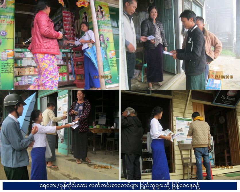 ကယ်ဆယ်ရေးနှင့်ပြန်လည်နေရာချထားရေးဦးစီးဌာန၊ ချင်းပြည်နယ်ဦးစီးမှူးရုံးမှ ဝန်ထမ်းများ သည် (၂၄-၁၀-၂၀၁၆)ရက်နေ့တွင် သဘာ၀ဘေးအန္တရာယ်ဆိုင်ရာ လက်ကမ်းစာစောင်များနှင့် ပိုစတာများဖြစ်သည့် ရေဘေး/မုန်တိုင်းဘေး ပိုစတာများအား ကားဂိတ်၊ လမ်းဆုံလမ်းခွ၊ စားသောက်ဆိုင်၊ အ.ထ.က(၂)ကျောင်းရှေ့စသည့် လူစည်ကားသည့်နေရာများတွင်ကပ်ခြင်း၊ မြန်မာဘာသာဖြင့်ရေးသော ဘေး(၈)မျိုး လက်ကမ်းစာစောင်များနှင့် ဟားခါးချင်းဘာသာဖြင့် ရေးသားထားသော ရေဘေး/မုန်တိုင်းဘေး လက်ကမ်းစာစောင်များ စုစုပေါင်း စာစောင်ရေ (၁၀၀) ကို ပြည်သူများသို့ ဖြန့်ဝေပေးခြင်းများ ပြုလုပ်ဆောင်ရွက်ခဲ့ကြောင်းသတင်းရရှိပါသည်။