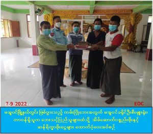 ဧရာဝတီတိုင်းဒေသကြီး၊ မအူပင်ခရိုင်၊ ပန်းတနော်မြို့နယ်၊ တောကျောင်းကျေးရွာအုပ်စု၊ နံကပ်ရိုး၊ နံကပ်နှင့်ကျောင်းတော်ကလေးကျေးရွာများ၌ (၆-၉-၂၀၂၂)ရက်နေ့တွင် ဖြစ်ပွားခဲ့သောကမ်းပြိုဘေးကြောင့် ကြိုတင်ဖျက်သိမ်းပြောင်းရွှေ့ရသည့် နေအိမ်(၁၂)လုံး၊ အိမ်ထောင်စု (၁၂)စုမှ လူဦးရေ(၄၅)ဦးအတွက် ဆန်ရိက္ခာ(၇)ရက်စာဖိုး ထောက်ပံ့ငွေ(၉၄,၅၀ဝိ/-)၊ အိမ်ဆောက်ပစ္စည်းဖိုး ထောက်ပံ့ငွေ(၁,၂၀၀,၀၀ဝိ/-)၊ ထောက်ပံ့ငွေစုစုပေါင်း(၁,၂၉၄,၅၀ဝိ/-)နှင့် ကာဘော်လိပ်ဆပ်ပြာ(၁၂)တောင့်အား (၇-၉-၂၀၂၂)ရက်နေ့ (၁၄:၄၅)အချိန်တွင် ဘေးအန္တရာယ်ဆိုင်ရာစီမံခန့်ခွဲမှုဦးစီးဌာန၊ မအူပင်ခရိုင်ဦးစီးမှူးရုံး တာဝန်ရှိသူများသည် သက်ဆိုင်ရာတာဝန်ရှိသူများနှင့်အတူ ဘေးသင့်ပြည်သူများထံသို့ ကွင်းဆင်းထောက်ပံ့ပေးခဲ့ကြောင်း သတင်းရရှိပါသည်။