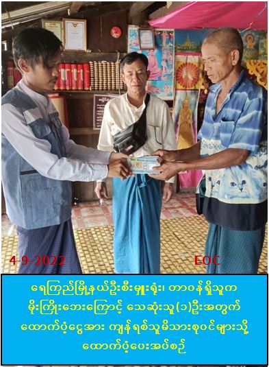 (၄-၉-၂၀၂၂)ရက်နေ့တွင် ဧရာဝတီတိုင်းဒေသကြီး၊ ရေကြည်မြို့နယ်၊ အသုတ်မြို့၊ ထန်းကျွန်းဆိပ်သာကျေးရွာအုပ်စု၊ ဆိပ်သာကျေးရွာ၊ ငါးရှဉ့်ချောင်းအနီး၌ မိုးကြိုးပစ်မှုကြောင့် သေဆုံးသူ(၁)ဦးအတွက် ထောက်ပံ့ရန်ပုံငွေ(၃၀၀,၀၀ဝိ/-)ကျပ်အား (၈-၉-၂၀၂၂)ရက်နေ့ (၁၄:၀၀)နာရီအချိန်တွင် ဘေးအန္တရာယ်ဆိုင်ရာစီမံခန့်ခွဲမှုဦးစီးဌာန၊ ရေကြည်မြို့နယ်ဦးစီးမှူးရုံး တာဝန်ရှိသူများက ကျန်ရစ်သူမိသားစုဝင်များထံသို့ သွားရောက်ထောက်ပံ့ပေးခဲ့ကြောင်း သတင်းရရှိပါသည်။