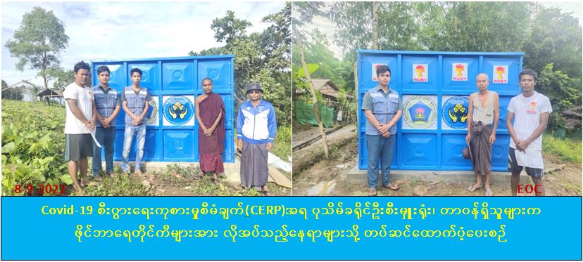 ဘေးအန္တရာယ်ဆိုင်ရာစီမံခန့်ခွဲမှုဦးစီးဌာန၊ ပုသိမ်ခရိုင်ဦးစီးမှူးရုံးမှ တာ၀န်ရှိသူများ သည် Covid-19 စီးပွားရေးကုစားမှုစီမံချက်(CERP)ဖြင့် ဝယ်ယူထားသည့် ဖိုင်ဘာရေတိုင်ကီ (၅)လုံး(ရေတိုင်ကီတစ်လုံးလျှင် ရေဂါလံ(၂၄၀၀)ဆံ့)အား (၇-၉-၂၀၂၂)ရက်နေ့တွင် ကျုံပျော် ခရိုင်၊ ကျောင်းကုန်းမြို့နယ်၊ သဲကုန်ကျေးရွာအုပ်စု၊ အ.မ.က(သဲကုန်)နှင့် ဆိပ်သာကျေးရွာ အုပ်စု၊ အ.မ.က(ဆိပ်သာ)တို့၌လည်းကောင်း၊ (၈-၉-၂၀၂၂)ရက်နေ့တွင် ပုသိမ်ခရိုင်၊ သာပေါင်း မြို့နယ်၊ ကြက်သွန်ကွင်းကျေးရွာအုပ်စု၊ YGW မိဘမဲ့ပရဟိတကျောင်း၊ ပုသိမ်မြို့နယ်၊ ငွေဆောင်မြို့၊ သဇင်ကျေးရွာအုပ်စု၊ ရေသိုးကျေးရွာနှင့် ဖုန်းဆိုးကြီးကျေးရွာတို့၌လည်းကောင်း ကုမ္ပဏီမှ တာ၀န်ရှိသူများနှင့်အတူ ကွင်းဆင်း၍ အသီးသီးတပ်ဆင်ဆောင်ရွက်ပေးခဲ့ကြောင်း သတင်း ရရှိပါသည်။