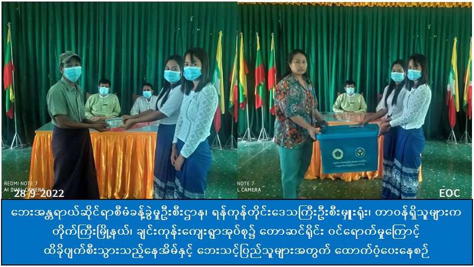 လူမှုဝန်ထမ်း၊ ကယ်ဆယ်ရေးနှင့်ပြန်လည်နေရာချထားရေးဝန်ကြီးဌာန၊ ဘေးအန္တရာယ်ဆိုင်ရာ စီမံခန့်ခွဲမှုဦးစီးဌာန ၊ ရန်ကုန်တိုင်းဒေသကြီးဦးစီးမှူးရုံးမှ တာဝန်ရှိသူများသည် (၂၆-၉-၂၀၂၂)ရက်နေ့တွင် တိုက်ကြီးမြို့နယ်၊ ချင်းကုန်းကျေးရွာအုပ်စု၊ သဲဝါကျေးရွာ၌ တောဆင်ရိုင်းဝင်ရောက်မှုကြောင့် သေဆုံးသူ(၁)ဦးအတွက် ထောက်ပံ့ငွေ(၃၀၀,၀၀ဝိ/-)ကျပ်နှင့် ဒဏ်ရာရရှိသူ(၁)ဦးအတွက် ထောက်ပံ့ငွေ(၅၀,၀၀ဝိ/-)ကျပ်အားလည်းကောင်း၊ (၂၈-၉-၂၀၂၂)ရက်နေ့တွင် တိုက်ကြီးမြို့နယ်၊ ချင်းကုန်းကျေးရွာအုပ်စု၊ ဘန်ဘွေးကျေးရွာ၌ တောဆင်ရိုင်းဝင်ရောက်မှုကြောင့် တစ်စိတ်တစ်ပိုင်းပျက်စီးသွားသည့်နေအိမ်(၁)လုံးအတွက် ကယ်ဆယ်ရေးပစ္စည်း(၁၇)မျိုးပါ ပလပ်စတစ်ပုံး(၁)ပုံး၊ အိမ်ဆောက်ပစ္စည်းဖိုးထောက်ပံ့ငွေ(၁၀၀,၀၀ဝိ/-)ကျပ်နှင့် လူဦးရေ(၃)ဦးအတွက် ဆန်ရိက္ခာဖိုးထောက်ပံ့ငွေ(၆,၃၀ဝိ/-)ကျပ်အားလည်းကောင်း အသီးသီးထောက်ပံ့ပေးရာတွင် ထောက်ပံ့ငွေစုစုပေါင်းမှာ (၄၅၆,၃၀ဝိ/-)ကျပ်ဖြစ်ပြီး (၂၉-၉-၂၀၂၂)ရက်နေ့တွင် သက်ဆိုင်ရာတာဝန်ရှိသူများရှေ့မှောက်၌ ဘေးသင့်ပြည်သူများလက်ဝယ်အရောက် ထောက်ပံ့ပေးခဲ့ကြောင်း သတင်းရရှိပါသည်။