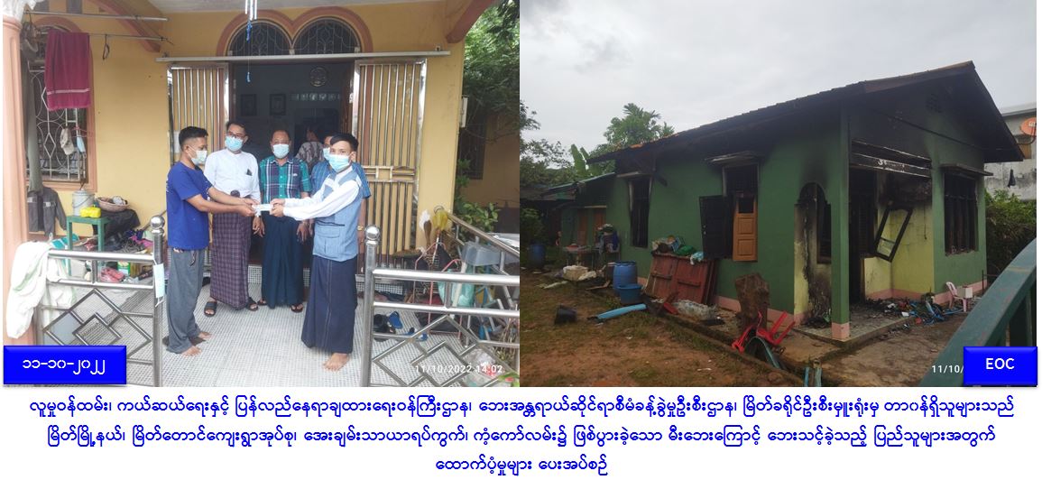 လူမှုဝန်ထမ်း၊ ကယ်ဆယ်ရေးနှင့် ပြန်လည်နေရာချထားရေးဝန်ကြီးဌာန၊ ဘေးအန္တရာယ်ဆိုင်ရာစီမံခန့်ခွဲမှုဦးစီးဌာန၊ မြိတ်ခရိုင်ဦးစီးမှူးရုံးမှ တာ၀န်ရှိသူများသည် (၁၀-၁၀-၂၀၂၂) ရက်နေ့တွင် မြိတ်မြို့နယ်၊ မြိတ်တောင်ကျေးရွာအုပ်စု၊ အေးချမ်းသာယာရပ်ကွက်၊ ကံ့ကော်လမ်း၌ ဖြစ်ပွားခဲ့သော မီးဘေးကြောင့် တစ်စိတ်တစ်ပိုင်းပျက်စီးခဲ့သည့်အိမ်ခြေ(၁)လုံးအတွက် အိမ်ဆောက်ပစ္စည်းဖိုး(၅၀,၀၀ဝိ/-)ကျပ်၊ ဘေးသင့်အိမ်ထောင်စု(၁)စုမှ လူဦးရေ(၄)ဦးအတွက် (၇)ရက်စာဆန်ရိက္ခာဖိုး (၈,၄၀ဝိ/-)ကျပ်၊ စုစုပေါင်းထောက်ပံ့ငွေ(၅၈,၄၀ဝိ/-)ကျပ်အား မြိတ်မြို့နယ်စီမံအုပ်ချုပ်ရေးအဖွဲ့ဝင်(၂)နှင့်အတူ (၁၁-၁၀-၂၀၂၂)ရက်နေ့၊ (၁၄:၀၀)အချိန်တွင် ထောက်ပံ့ပေးအပ်ခဲ့ကြောင်း သိရှိရပါသည်။