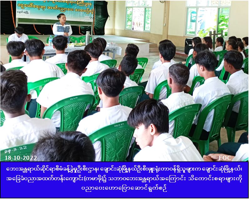 လူမှုဝန်ထမ်း၊ ကယ်ဆယ်ရေးနှင့်ပြန်လည်နေရာချထားရေးဝန်ကြီးဌာန၊ ဘေးအန္တရာယ် ဆိုင်ရာစီမံခန့်ခွဲမှုဦးစီးဌာန၊ မွန်ပြည်နယ်၊ ချောင်းဆုံမြို့နယ်ဦးစီးမှူးရုံးမှ ဝန်ထမ်းများသည် (၁၈-၁၀-၂၀၂၂)ရက်နေ့၊ နံနက်ပိုင်းတွင် ချောင်းဆုံမြို့နယ်၊ အ.ထ.က(ခွဲ) ကမာမိုစာသင်ကျောင်း၌ ကျောင်းသား/သူ(၁၅၀)ဦးခန့်အား သဘာဝဘေး အန္တရာယ်နှင့်ပတ်သက်သည့် ဆောင်ရန်၊ ရှောင်ရန်အချက်များကို အသိပညာပေးခြင်း၊ ဘေးအန္တရာယ်မကျရောက်မီ ကြိုတင်ပြင်ဆင်ခြင်းနှင့် ကြိုတင်ကာကွယ်ခြင်းလုပ်ငန်းစဉ်များအကြောင်းအား ဆွေးနွေးဟောပြောခဲ့ပါသည်။ ထို့နောက် အသိပညာပေးဟောပြောပွဲသို့ တက်ရောက်လာသည့် ကျောင်းသား/သူများသို့ သဘာဝဘေးလက်ကမ်းစာစောင်များ ဖြန့်ဝေပေးခြင်းနှင့် စာသင်ကျောင်းအတွက် သဘာဝဘေးအန္တရာယ်အသိပညာပေးဗီနိုင်းပိုစတာပေးအပ်ခဲ့ကြောင်း သတင်းရရှိပါသည်။