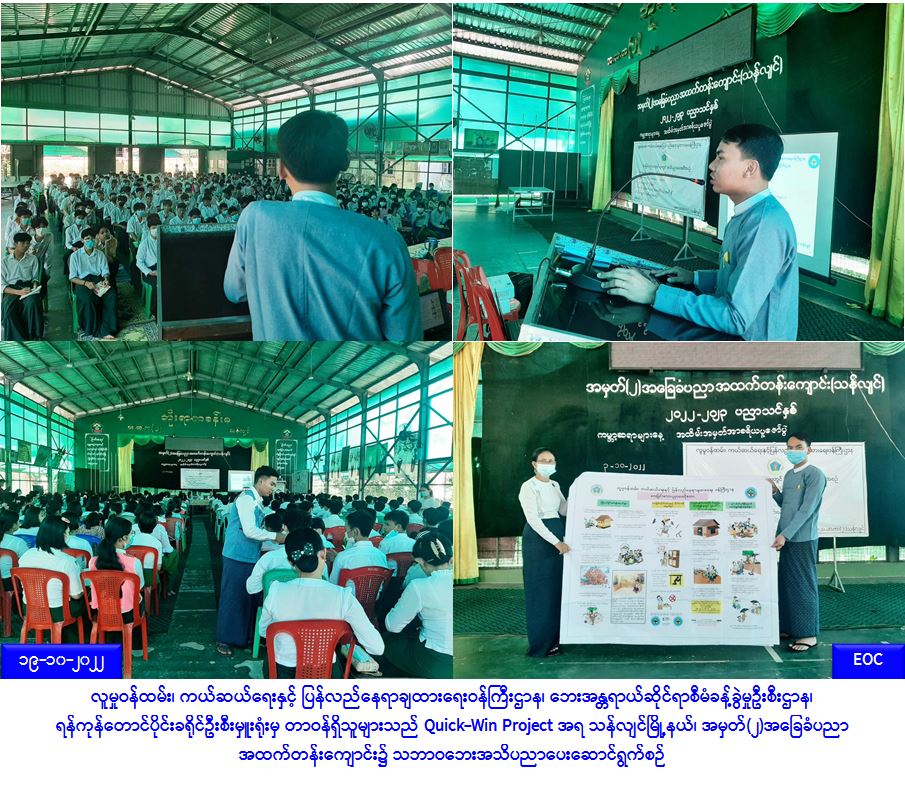 လူမှုဝန်ထမ်း၊ ကယ်ဆယ်ရေးနှင့် ပြန်လည်နေရာချထားရေးဝန်ကြီးဌာန၊ ဘေးအန္တရာယ်ဆိုင်ရာစီမံခန့်ခွဲမှုဦးစီးဌာန၊ ရန်ကုန်တောင်ပိုင်းခရိုင်ဦးစီးမှူးရုံးမှ တာဝန်ရှိသူများသည် Quick-Win Project အရ လူမှုဝန်ထမ်းဦးစီးဌာန၊ ပြန်လည်ထူထောင်ရေးဦးစီးဌာနတို့နှင့်ပူးပေါင်း၍ (၁၉-၁၀-၂၀၂၂)ရက်နေ့တွင် ရန်ကုန်တိုင်းဒေသကြီး၊ သန်လျင်ခရိုင်၊ သန်လျင်မြို့နယ်၊ အမှတ်(၂)အခြေခံပညာအထက်တန်းကျောင်းမှ ဆရာ၊ဆရာမများနှင့် ကျောင်းသား၊ကျောင်းသူများအား သဘာဝဘေးအသိပညာများ ဆွေးနွေးပြောကြားခြင်း၊ သဘာ၀အသိပညာပေး Video click များ ပြသခြင်း၊ အသိပညာပေးလက်ကမ်းစာစောင်များနှင့်ဗီနိုင်းများ ဖြန့်ဝေပေးခြင်းတို့ ဆောင်ရွက်ခဲ့ကြောင်း သတင်းရရှိပါသည်။