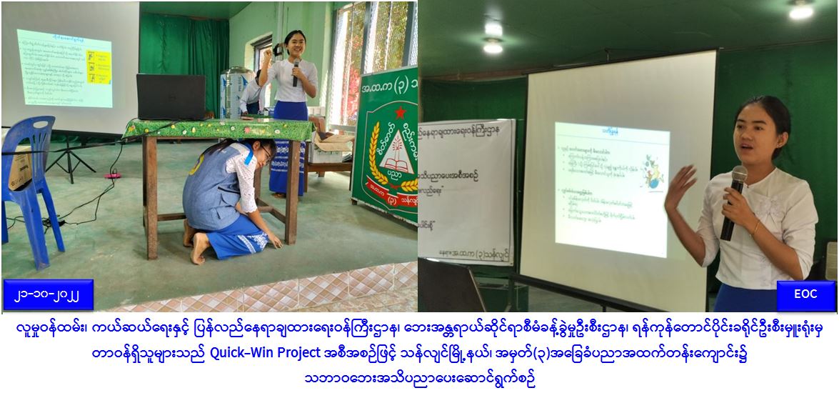 လူမှုဝန်ထမ်း၊ ကယ်ဆယ်ရေးနှင့် ပြန်လည်နေရာချထားရေးဝန်ကြီးဌာန၊ ဘေးအန္တရာယ်ဆိုင်ရာစီမံခန့်ခွဲမှုဦးစီးဌာန၊ ရန်ကုန်တောင်ပိုင်းခရိုင်ဦးစီးမှူးရုံးမှ တာဝန်ရှိသူများသည် Quick-Win Project အစီအစဉ်ဖြင့် လူမှုဝန်ထမ်းဦးစီးဌာန၊ ပြန်လည်ထူထောင်ရေးဦးစီးဌာနတို့နှင့် ပူးပေါင်း၍ (၂၁-၁၀-၂၀၂၂) ရက်နေ့တွင် ရန်ကုန်တိုင်းဒေသကြီး၊ သန်လျင်ခရိုင်၊ သန်လျင်မြို့နယ်၊ အမှတ်(၃)အခြေခံပညာအထက်တန်းကျောင်းမှ ဆရာ၊ ဆရာမများနှင့် ကျောင်းသား၊ ကျောင်းသူများအား သဘာဝဘေးအသိပညာပေးဆွေးနွေးပြောကြားခြင်း၊ သဘာ၀အသိပညာပေး Video click များ ပြသခြင်းတို့ ဆောင်ရွက်ခဲ့ပြီး အသိပညာပေးလက်ကမ်းစာစောင်များနှင့်ဗီနိုင်းများအား ဖြန့်ဝေပေးခဲ့ကြောင်း သိရှိရပါသည်။
