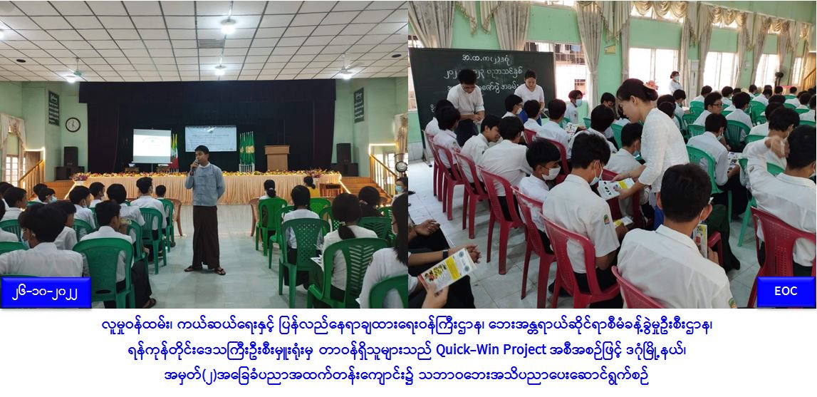 လူမှုဝန်ထမ်း၊ ကယ်ဆယ်ရေးနှင့် ပြန်လည်နေရာချထားရေးဝန်ကြီးဌာန၊ ဘေးအန္တရာယ်ဆိုင်ရာစီမံခန့်ခွဲမှုဦးစီးဌာန၊ ရန်ကုန်တိုင်းဒေသကြီးဦးစီးမှူးရုံးမှ တာဝန်ရှိသူများသည် Quick-Win Project အစီအစဉ်ဖြင့် လူမှုဝန်ထမ်းဦးစီးဌာန၊ ပြန်လည်ထူထောင်ရေးဦးစီးဌာနတို့နှင့် ပူးပေါင်း၍ (၂၆-၁၀-၂၀၂၂) ရက်နေ့တွင် ရန်ကုန်တိုင်းဒေသကြီး၊ ကျောက်တံတားခရိုင်၊ ဒဂုံမြို့နယ်၊ အမှတ်(၂)အခြေခံပညာအထက်တန်းကျောင်းမှ ဆရာ၊ဆရာမများနှင့် ကျောင်းသား၊ကျောင်းသူများအား သဘာဝဘေးအသိပညာများ ဆွေးနွေးပြောကြားခဲ့ပြီး အသိပညာပေးလက်ကမ်းစာစောင်များနှင့် ဗီနိုင်းပိုစတာများအား ဖြန့်ဝေပေးခဲ့ကြောင်း သိရှိရပါသည်။