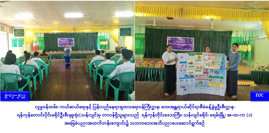 လူမှုဝန်ထမ်း၊ ကယ်ဆယ်ရေးနှင့် ပြန်လည်နေရာချထားရေးဝန်ကြီးဌာန၊ ဘေးအန္တရာယ်ဆိုင်ရာစီမံခန့်ခွဲမှုဦးစီးဌာန၊ ရန်ကုန်တောင်းပိုင်းခရိုင်ဦးစီးမှူးရုံး(သန်လျင်)မှ တာဝန်ရှိသူများသည် ရန်ကုန်တိုင်းဒေသကြီး၊ သန်လျင်ခရိုင်၊ ခရမ်းမြို့၊ အ-ထ-က (၁) အခြေခံပညာအထက်တန်းကျောင်း၌ (၉-၁၂-၂၀၂၂) ရက်နေ့၊ နံနက်(၉:၃၀)နာရီအချိန်မှ (၁၁:၃၀)နာရီအချိန်ထိ သဘာဝဘေးအန္တရာယ်ဆိုင်ရာသိကောင်းစရာများနှင့်ပတ်သက်၍ ကျောင်းသား၊ ကျောင်းသူဦးရေ(၂၀၀)ဦးအား ဆွေးနွေးဟောပြောခြင်း၊ တာဝန်ရှိဝန်ထမ်းများမှ ဘေးတစ်မျိုးချင်းစီအလိုက် အသိပညာပေးဆွေးနွေးဟောပြောခြင်း၊ လက်ကမ်းစာစောင်မျာဖြန့်ဝေခြင်းနှင့် ဗီနိုင်းပိုစတာများအား ကျောင်းအုပ်ဆရာမကြီးထံ ပေးအပ်ခြင်းများ ဆောင်ရွက်ခဲ့ကြောင်း သိရှိရပါသည်။