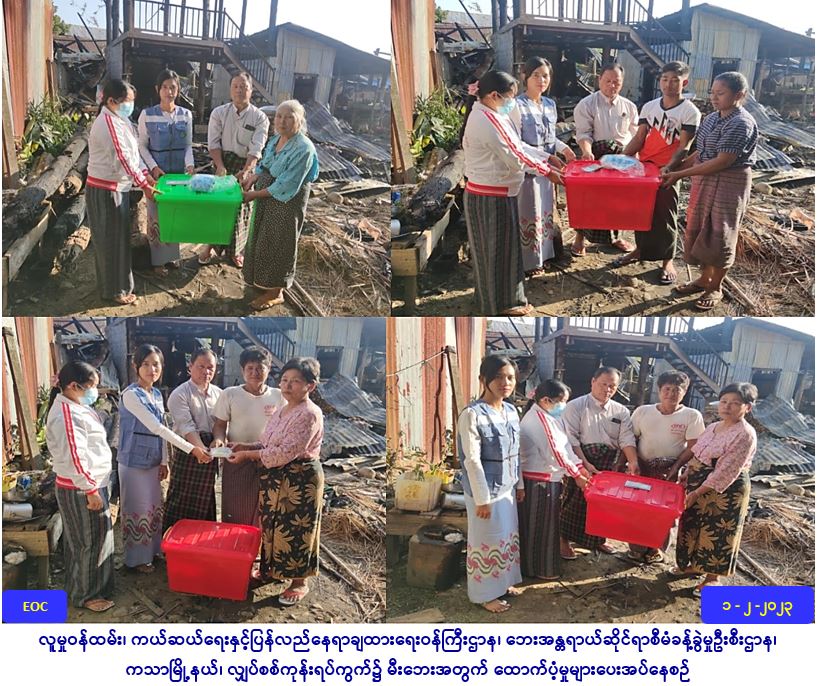 လူမှုဝန်ထမ်း၊ ကယ်ဆယ်ရေးနှင့်ပြန်လည်နေရာချထားရေးဝန်ကြီးဌာန၊ ဘေးအန္တရာယ်ဆိုင်ရာစီမံခန့်ခွဲမှု ဦးစီးဌာန၊ ကသာခရိုင် ဦးစီးမှူးရုံးမှ တာဝန်ရှိသူများသည် (၁-၂-၂၀၂၃)ရက်နေ့ (၀၅း၁၀)နာရီအချိန်ခန့်၌ ကသာမြို့နယ်၊ လျှပ်စစ်ကုန်းရပ်ကွက်၌ မီးလောင်မှုကြောင့် ပျက်စီးဆုံးရှုံးခဲ့သည့် အိမ်ခြေ(၄)လုံး၊ အိမ်ထောင်စု(၄)စုမှ လူဦးရေ (၂၀)ဦးတို့အတွက် ဆန်ရိက္ခာဖိုးထောက်ပံ့ ငွေ (၄၂၀၀၀/-)ကျပ်၊ အိမ်ဆောက်ပစ္စည်းဖိုးထောက်ပံ့ငွေ (၇၀၀၀၀၀/-)ကျပ် စုစုပေါင်းထောက်ပံ့ငွေ (၇၄၂၀၀၀/-)ကျပ်နှင့် Family Kits (၄)ပုံး၊ လူ(၁)ဦးလျှင်အဝတ် (Mask)(၂)ခုနှုန်းဖြင့် လူ(၂၀)ဦးအတွက် အဝတ်(Mask) (၄၀)ခုတို့အား ကသာမြို့နယ်စီမံအုပ်ချုပ်ရေး အဖွဲ့နှင့်အတူ ဘေးသင့်ပြည်သူများထံသို့ (၁-၂-၂၀၂၃) ရက်နေ့၊ (၁၆:၁၇)နာရီအချိန်တွင် ကွင်းဆင်းသွားရောက် ထောက်ပံ့ပေးခဲ့ပါကြောင်း သတင်းရရှိပါသည်။