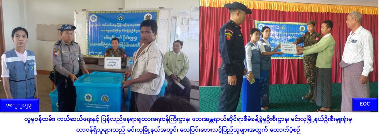လူမှုဝန်ထမ်း၊ ကယ်ဆယ်ရေးနှင့် ပြန်လည်နေရာချထားရေးဝန်ကြီးဌာန၊ ဘေးအန္တရာယ်ဆိုင်ရာစီမံခန့်ခွဲမှုဦးစီးဌာန၊ ပဲခူးတိုင်းဒေသကြီး၊ သာယာဝတီခရိုင်၊ မင်းလှမြို့နယ်ဦးစီးမှူးရုံးမှ တာဝန်ရှိသူများသည် (၁၇-၂-၂၀၂၃) ရက်နေ့၊ (၁၆:၂၀) နာရီအချိန်တွင် မင်းလှမြို့နယ်အတွင်းရှိ ကျေးရွာအုပ်စု(၅)စု၊ ကျေးရွာ(၅)ရွာတို့၌ အချိန်အခါမဟုတ်မိုးသည်းထန်စွာရွာသွန်းပြီး လေပြင်းတိုက်ခတ်မှုကြောင့် ပြိုလဲလူနေအိမ်(၆)လုံး၊ အမိုးလန်ပျက်စီးလူနေအိမ်(၁၈)လုံးနှင့် ဘ/က(၁)ကျောင်းများအတွက် ကျောင်း/အိမ်ဆောက်ပစ္စည်းဖိုးထောက်ပံ့ငွေ(၁၃၅၀၀၀ဝိ/-)ကျပ်၊ အိမ်ထောင်စု(၂၄)စုရှိ လူဦးရေ(၉၅)ဦးအတွက် ဆန်ဖိုးထောက်ပံ့ငွေ(၁၉၉၅၀ဝိ/-)ကျပ်၊ စုစုပေါင်းထောက်ပံ့ငွေ(၁၅၄၉၅၀ဝိ/-)ကျပ်နှင့် လေးထောင့်ပလပ်စတစ်ပုံးအပါ ကယ်ဆယ်ရေးပစ္စည်း(၁၇)မျိုး(၆)ပုံး၊ စက္ကူကတ်ထူပုံး(၆)ပုံးတို့အား(၁၈-၂-၂၀၂၃)ရက်နေ့၊ (၀၉:၀၀)နာရီအချိန်တွင် ဘေးဖြစ်ပွားရာ ထန်းပင်ကုန်းကျေးရွာအုပ်စု၊ ချောင်းနက်ကျေးရွာအခြေခံပညာမူလတန်းလွန်ကျောင်းတွင် ဘေးသင့်ပြည်သူများလက်ဝယ်အရောက် မြို့နယ်စီမံအုပ်ချုပ်ရေးအဖွဲ့ ခေတ္တဥက္ကဌနှင့်တာဝန်ရှိသူများ၊ မြို့နယ်ရဲမှူး၊ မြို့နယ်မီးသတ်ဦးစီးမှူး၊ ပြန်ဆက်မှတာဝန်ရှိသူများ၊ ကျေးရွာအုပ်ချုပ်ရေးမှူးများ၊ ရပ်ကျေးစာရေးများ၊ လူမှုရေးအသင်းအဖွဲ့များနှင့်အတူ သွားရောက်ထောက်ပံ့ပြီးဖြစ်ကြောင်း သိရှိရပါသည်။