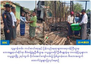 လပွတ္တာခရိုင်ဦးစီးမှူးရုံးမှတာဝန်ရှိသူများသည် လပွတ္တာမြို့၂ရပ်ကွက်၊ ဗိုလ်အောင်ကျော်လမ်း၌ (၁၂.၄.၂၀၂၃)ရက်နေ့တွင် ဖြစ်ပွားသော မီးလောင်မှုကြောင့် လုံးဝပျက်စီးနေအိမ်(၁)လုံး၊ကြိုတင်ဖျက်သိမ်းနေအိမ် (၁)လုံး၊ အိမ်ထောင်စု(၁)စုမှ ဘေးသင့်လူဦးရေ (၄)ဦးအတွက် ၊ကယ်ဆယ်ရေးပစ္စည်း(၁၇)မျိုးပါ (၁)ပုံး၊ ဆန်ရိက္ခာဘိုး (၈၄၀၀ိ/-)၊ အိမ်ဆောက်ပစ္စည်းဘိုး (၂၀၀၀၀၀ိိ/-)၊ စုစုပေါင်း (၂၀၈၄၀၀ိ/-)အား သက်ဆိုင်ရာတာဝန်ရှိသူများနှင့်အတူ ဘေးသင့်ပြည်သူများထံ သွားရောက်ထောက်ပံ့ပေးအပ်ခဲ့ကြောင်း သတင်းရရှိပါသည်။