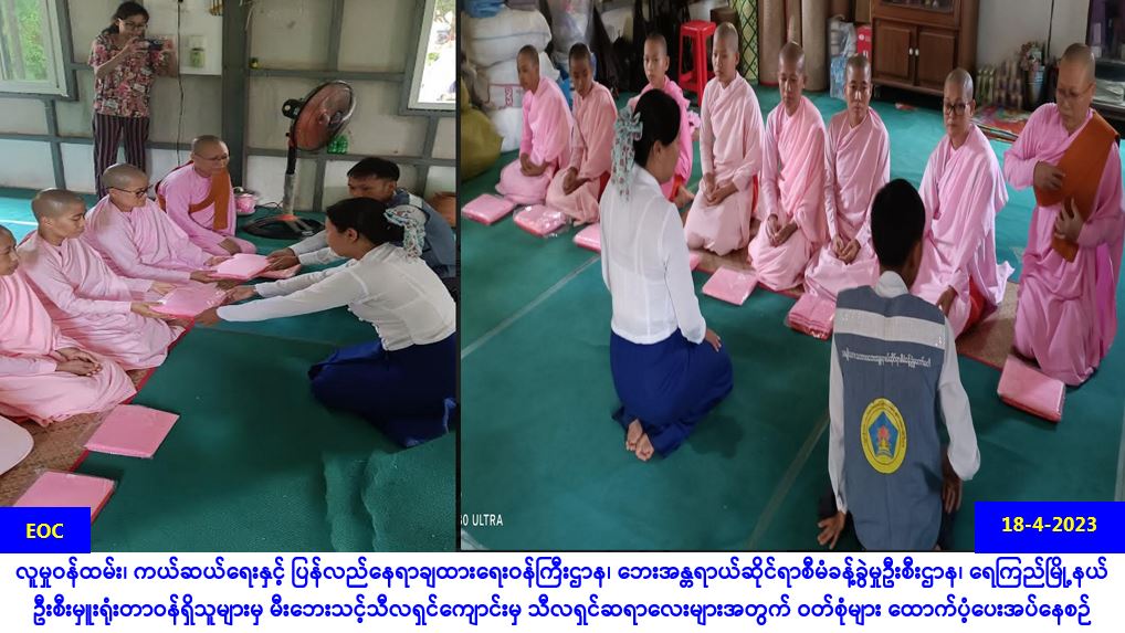 လူမှုဝန်ထမ်း၊ ကယ်ဆယ်ရေးနှင့် ပြန်လည်နေရာချထားရေးဝန်ကြီးဌာန၊ ဘေးအန္တရာယ်ဆိုင်ရာစီမံခန့်ခွဲမှု ဦးစီးဌာန၊ ရေကြည်မြို့နယ်ဦးစီးမှူးရုံးမှတာဝန်ရှိသူများသည် ရေကြည်မြို့နယ်၊ ငါးသိုင်းချောင်းမြို့၊ ရှေ့ဆောင်ရပ်ကွက် ဗိုလ်ချုပ်လမ်း၊ ခန့်မှန်းမြေပုံညွှန်း (GQ-202238)၌ (၂-၄-၂၀၂၃) ရက်နေ့တွင် ဖြစ်ပွား ခဲ့သော မီးဘေးကြောင့် လုံးဝပျက်စီး သီလရှင်ကျောင်း(၂)ကျောင်းနှင့် တစ်စိတ်တစ်ပိုင်းပျက်စီး သီလရှင် ကျောင်း (၁) ကျောင်းရှိ စုစုပေါင်း သီလရှင်(၁၂)ပါးအတွက် သီလရှင်ဝတ်စုံ(၁၂)စုံအား (၁၈-၄-၂၀၂၃) ရက်နေ့တွင် ထောက်ပံ့လှူဒါန်းခဲ့ပါကြောင်း သတင်းရရှိပါသည်။