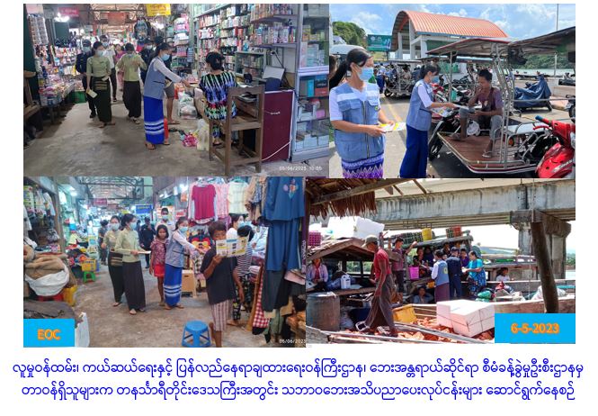 လူမှုဝန်ထမ်း၊ ကယ်ဆယ်ရေးနှင့် ပြန်လည်နေရာချထားရေးဝန်ကြီးဌာန၊ ဘေးအန္တရာယ်ဆိုင်ရာ စီမံခန့်ခွဲမှုဦးစီးဌာနမှ တာဝန်ရှိသူများသည် တနင်္သာရီတိုင်းဒေသကြီး၊ မြိတ်မြို့နယ်၊ ပုလောမြို့နယ်၊ တနင်္သာရီမြို့နယ်၊ ကော့သောင်းမြို့နယ်နှင့် ထားဝယ်မြို့နယ် အတွင်းရှိ ဈေးများ၊ စက်လှေဆိပ်များနှင့် လူစည်ကားရာရပ်ကွက်များရှိ ပြည်သူများကို မိုးတွင်းကာလဖြစ်ပွားတတ်သော မုန်တိုင်းဘေး၊ လေပြင်းဘေး၊ မိုးကြိုးဘေးနှင့် မြေပြိုဘေးများနှင့် ပတ်သက်၍ ဆောင်ရန် ရှောင်ရန် အချက်များအား ဌာနဆိုင်ရာများနှင့်အတူ အသိပညာဆောင်ရွက်ခဲ့ပြီး လက်ကမ်းစာစောင်များ ဖြန့်ဝေပေးခဲ့ပါကြောင်း သတင်းရရှိပါသည်။