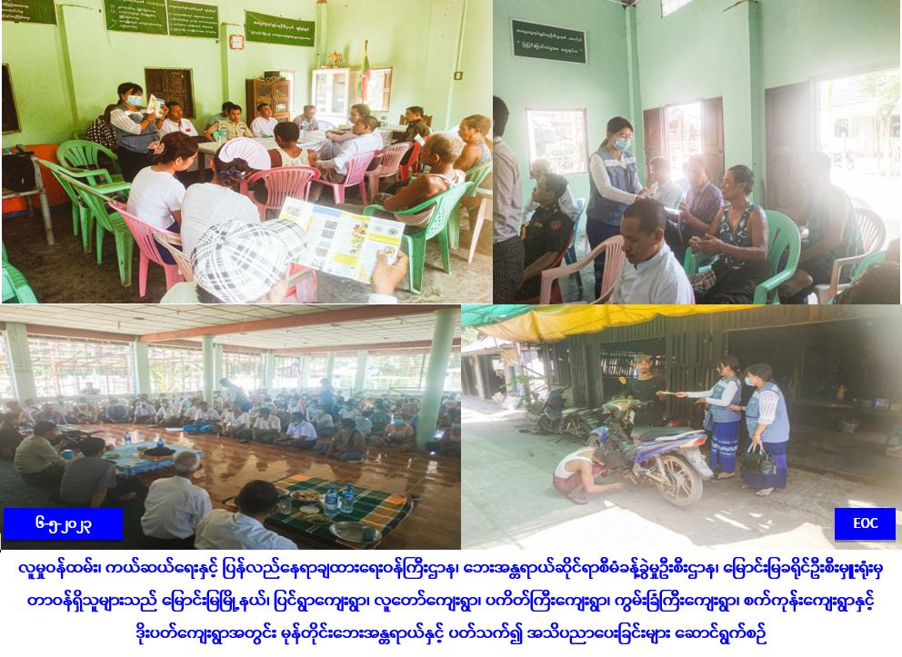 လူမှုဝန်ထမ်း၊ ကယ်ဆယ်ရေးနှင့် ပြန်လည်နေရာချထားရေးဝန်ကြီးဌာန၊ ဘေးအန္တရာယ်ဆိုင်ရာစီမံခန့်ခွဲမှုဦးစီးဌာန၊ ဘေးအန္တရာယ်ဆိုင်ရာစီမံခန့်ခွဲမှုဦးစီးဌာန၊ မြောင်းမြခရိုင်ဦးစီးရုံးမှ တာဝန်ရှိသူများသည် (၆-၅-၂၀၂၃)ရက်နေ့၊ နံနက်(၀၆:၀၀)နာရီအချိန်မှ ညနေ(၁၆:၃၀)နာရီအချိန်ထိ မုန်တိုင်းအန္တရာယ်ထိခိုက်ခံစားနိုင်ခြေရှိသည့် ကျေးရွာများဖြစ်သော မြောင်းမြမြို့နယ်၊ ပြင်ရွာကျေးရွာ၊ လူတော်ကျေးရွာ၊ ပကိတ်ကြီးကျေးရွာ၊ ကွမ်းခြံကြီးကျေးရွာ၊ စက်ကုန်းကျေးရွာနှင့် ဒိုးပတ်ကျေးရွာတို့ရှိ ပြည်သူ(၆၀၀)ဦးအား ခရိုင်သဘာဝဘေးစီမံခန့်ခွဲမှုဥက္ကဌ၊ ဦးစန်းဌေး ဦးဆောင်သော ခရိုင်စီမံအုပ်ချုပ်ရေးအဖွဲ့ဝင်များ၊ မြို့နယ်စီမံအုပ်ချုပ်ရေးအဖွဲ့ဝင်များ၊ မီးသတ်ဦးစီးဌာန၊ မြန်မာနိုင်ငံရဲတပ်ဖွဲ့၊ ပို့ဆောင်ရေးနှင့်ဆက်သွယ်ရေးဦးစီးဌာနပါဝင်သော ဌာနဆိုင်ရာများနှင့်အတူသွားရောက်၍ မုန်တိုင်းဘေးမကျရောက်မီ၊ ကျရောက်နေစဥ်နှင့် ကျရောက်ပြီး လိုက်နာဆောင်ရွက်ရမည့်အချက်များအား ဟောပြောဆွေးနွေးခြင်း၊ လက်ကမ်းစာစောင်များ ဖြန့်ဝေခြင်းများ ဆောင်ရွက်ခဲ့ကြောင်း သတင်းရရှိပါသည်။