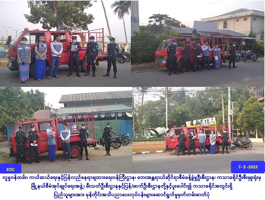 လူမှုဝန်ထမ်း၊ ကယ်ဆယ်ရေးနှင့်ပြန်လည်နေရာချထားရေးဝန်ကြီးဌာန၊ ဘေးအန္တရာယ်ဆိုင်ရာစီမံခန့်ခွဲမှု ဦးစီးဌာန၊ ကသာခရိုင်ဦးစီးမှူးရုံးမှ တာဝန်ရှိသူများသည် (၇-၅-၂၀၂၃)ရက်နေ့၊ ညနေ (၄:၃၀)နာရီမှ (၆:၀၀)နာရီအထိ လေဖိအားနည်းရပ်ဝန်းမှ အား ကောင်းသော ဆိုင်ကလုန်းမုန်တိုင်းအဖြစ်သို့ ပြောင်းလဲ လာပြီး မိုးသက်လေပြင်းများကျရောက်နိုင်သည့်အတွက် ကသာမြို့နယ်အတွင်းရှိ ပြည်သူများကြိုတင် သတိပြုနိုင်ရန်အတွက် ဆောင်ရန်၊ ရှောင်ရန်များစသည့်လိုအပ်သည်များဆောင်ရွက်နိုင် ရန်နှင့် မိုးလေဝသနှင့်ဇလဗေဒညွှန်ကြားမှုဦးစီးဌာန၏ အချိန်နှင့်တပြေးညီထုတ်ပြန်ချက်များကို စောင့်ကြည့်၍ လိုအပ်သည့် ကြိုတင်ပြင်ဆင်မှုများဆောင်ရွက်သွားနိုင်ရန်အတွက် မြို့နယ်စီမံအုပ်ချုပ်ရေးအဖွဲ့၊ မီးသတ် ဦးစီးဌာနနှင့်ပြန်/ဆက်ဦးစီးဌာနတို့နှင့်ပူးပေါင်း၍ ပြည်သူများအား အသိပေးတိုက်တွန်းနှိုးဆော်ခဲ့ပါ ကြောင်း သတင်းရရှိပါသည်။
