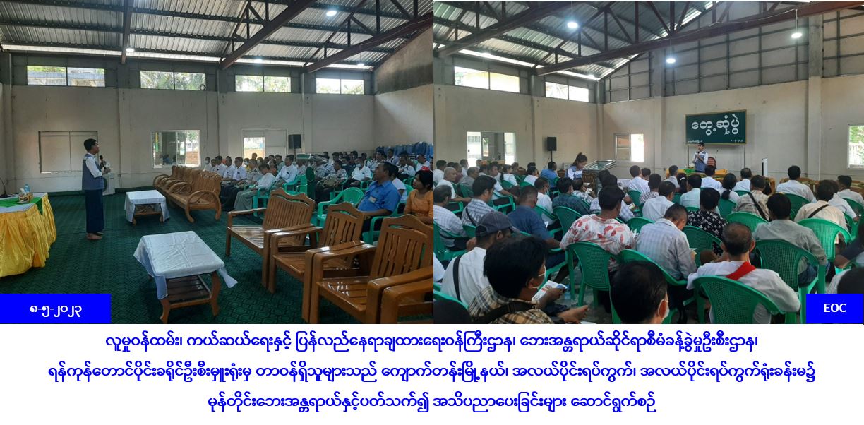 လူမှုဝန်ထမ်း၊ ကယ်ဆယ်ရေးနှင့် ပြန်လည်နေရာချထားရေးဝန်ကြီးဌာန၊ ဘေးအန္တရာယ်ဆိုင်ရာစီမံခန့်ခွဲမှုဦးစီးဌာန၊ ရန်ကုန်တောင်ပိုင်းခရိုင်ဦးစီးမှူးရုံးမှ တာဝန်ရှိသူများသည် (၈-၅-၂၀၂၃) ရက်နေ့၊ နေ့လည်(၁း၀၀)နာရီအချိန်တွင် ကျောက်တန်းမြို့နယ်၊ အလယ်ပိုင်းရပ်ကွက်၊ အလယ်ပိုင်းရပ်ကွက်ရုံးခန်းမ၌ မြို့နယ်အဆင့်ဌာနဆိုင်ရာများ၊ ရပ်ကွက်/ကျေးရွာအုပ်ချုပ်ရေးမှူးများနှင် ရပ်ကျေးစာရေးများအား မုန်တိုင်းနှင့်ပတ်သက်၍ သိကောင်းစရာများနှင့် ကြိုတင်ပြင်ဆင်ရမည့်အချက်များအား ဆွေးနွေးဟောပြောခြင်းနှင့် လက်ကမ်းစာစောင် ဖြန့်ဝေခြင်းများ ဆောင်ရွက်ခဲ့ကြောင်း သတင်းရရှိပါသည်။