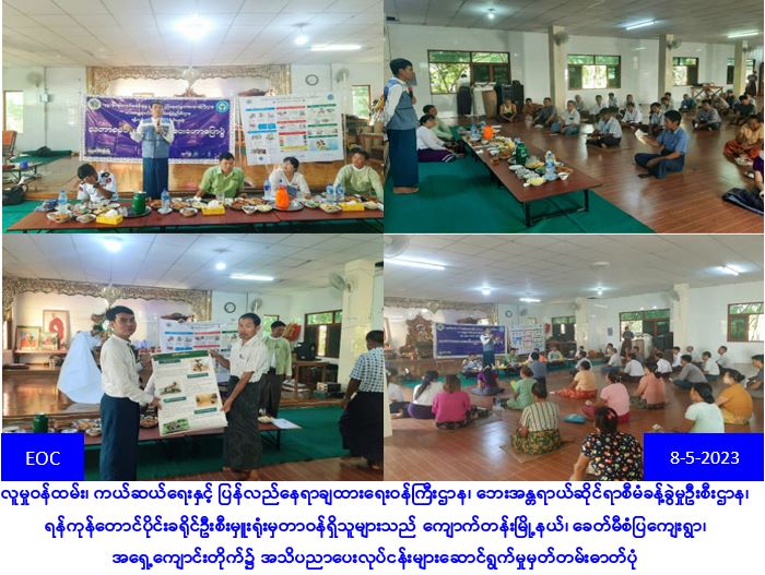 လူမှုဝန်ထမ်း၊ ကယ်ဆယ်ရေးနှင့် ပြန်လည်နေရာချထားရေးဝန်ကြီးဌာန၊ ဘေးအန္တရာယ် ဆိုင်ရာစီမံခန့်ခွဲမှုဦးစီးဌာန၊ ရန်ကုန်တောင်းပိုင်းခရိုင်ဦးစီးမှူးရုံးမှ တာဝန်ရှိသူများသည် ဌာနဆိုင်ရာ များနှင့် ပူးပေါင်း၍ (၈-၅-၂၀၂၃) ရက်နေ့တွင် ကျောက်တန်းမြို့နယ်၊ ခေတ်မီစံပြကျေးရွာ၊ အရှေ့ ကျောင်းတိုက်၌ မိုချာဆိုင်ကလုန်းမုန်တိုင်းနှင့် ပတ်သက်၍ ကြိုတင်ပြင်ဆင်မှုများ ဆောင်ရွက် နိုင်ရန်နှင့် မုန်တိုင်းကြောင့်ဆက်လက်ဖြစ်ပေါ်နိုင်သည့် လေပြင်းတိုက်ခတ်ခြင်း၊ မိုးသည်းထန်စွာ ရွာသွန်းခြင်းနှင့် ရေကြီးရေလျှံဖြစ်ပွားခြင်းဘေးအန္တရာယ်များကြောင့် ထိခိုက်ပျက်စီးဆုံးရှုံးမှု လျော့နည်း သက်သာစေရန်အတွက် မုန်တိုင်းဘေး၊ ရေဘေး၊ လေးပြင်းဘေးများနှင့် ပတ်သက်၍ ကြိုတင် ပြင်ဆင်ရမည့်အချက်များ၊ ဆောင်ရန်၊ ရှောင်ရန်အချက်များအား ပြည်သူများ သိရှိလိုက်နာဆောင်ရွက် နိုင်စေရန်အတွက် ဆွေးနွေးဟောပြောခြင်း၊ လက်ကမ်းစာစောင်များဖြန့်ဝေခြင်းနှင့် ဗီနိုင်း၊ ပိုစတာ ပေးအပ်ခြင်းများ ပြုလုပ်ဆောင်ရွက်ခဲ့ပါကြောင်းသတင်းရရှိပါသည်။