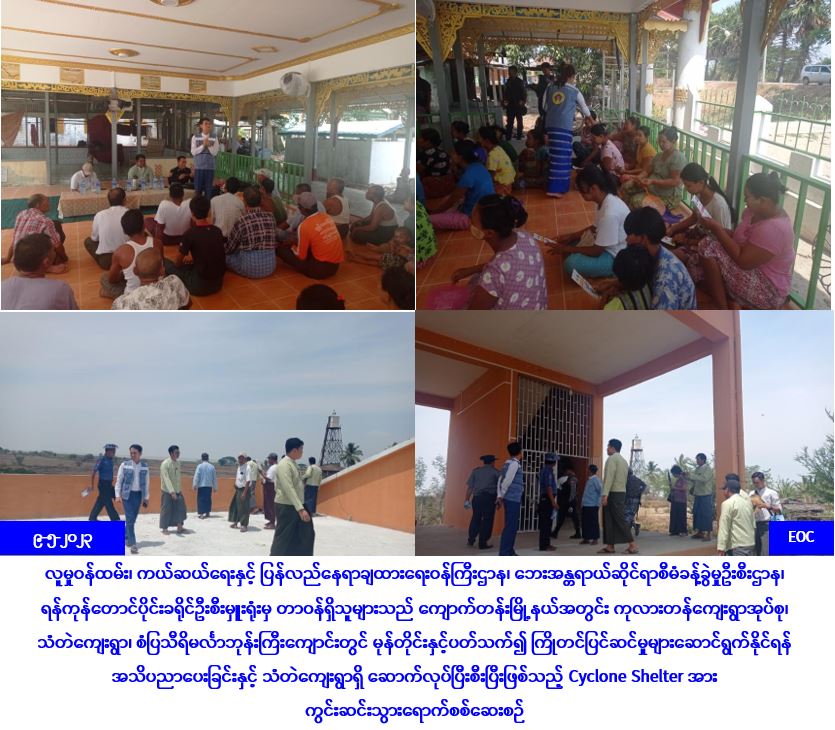 လူမှုဝန်ထမ်း၊ ကယ်ဆယ်ရေးနှင့် ပြန်လည်နေရာချထားရေးဝန်ကြီးဌာန၊ ဘေးအန္တရာယ်ဆိုင်ရာစီမံခန့်ခွဲမှုဦးစီးဌာန၊ ရန်ကုန်တောင်ပိုင်းခရိုင်ဦးစီးမှူးရုံးမှ တာဝန်ရှိသူများသည် ဌာနဆိုင်ရာများနှင့်ပူးပေါင်း၍ (၉-၅-၂၀၂၃) ရက်နေ့တွင် ကျောက်တန်းမြို့နယ်အတွင်း ကုလားတန်ကျေးရွာအုပ်စု၊ သံတဲကျေးရွာ၊ စံပြသီရိမင်္လာဘုန်းကြီးကျောင်းတွင် မုန်တိုင်းနှင့်ပတ်သက်၍ ကြိုတင်ပြင်ဆင်မှုများဆောင်ရွက်နိုင်ရန်နှင့် မုန်တိုင်းနှင့်အတူဖြစ်ပေါ်လာနိုင်သည့် လေပြင်းတိုက်ခတ်ခြင်း၊ မိုးသည်းထန်စွာရွာသွန်းခြင်း၊ ရေကြီးရေလျှံဖြစ်ပွားခြင်း၊ မုန်တိုင်းဒီရေစသည့် ဘေးအန္တရာယ်များကြောင့် ထိခိုက်ပျက်စီးဆုံးရှုံးမှု လျော့နည်းစေရန် မုန်တိုင်းဘေး၊ လေပြင်းဘေး၊ ရေဘေးနှင့် မုန်တိုင်းဒီရေများနှင့်ပတ်သက်၍ ကြိုတင်ပြင်ရမည့်အချက်များ၊ ဆောင်ရန်ရှောင်ရန်အချက်များအား ပြည်သူများသိရှိလိုက်နာဆောင်ရွက်နိုင်စေရန် ဆွေးနွေးဟောပြောခြင်း၊ လက်ကမ်းစာစောင်များဖြန့်ဝေခြင်း၊ ဗီနိုင်းပိုစတာပေးအပ်ခြင်းများ ဆောင်ရွက်ခဲ့ပြီး သံတဲကျေးရွာရှိ ဆောက်လုပ်ပြီးစီးပြီးဖြစ်သည့် cyclone shelterအား ကွင်းဆင်းသွားရောက်စစ်ဆေးမှုများ ဆောင်ရွက်ခဲ့ကြောင်း သတင်းရရှိပါသည်။