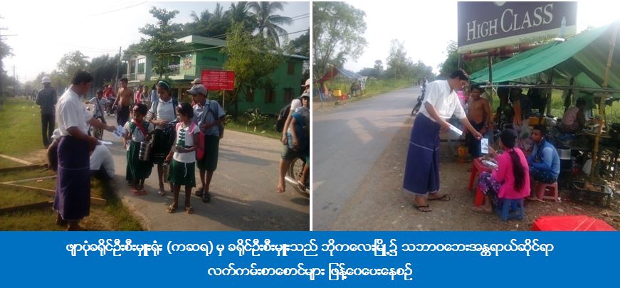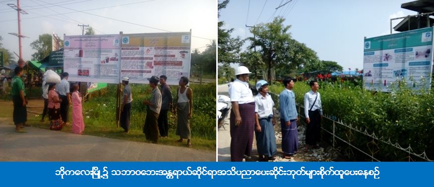 (၂၆-၁၀-၂၀၁၆) ရက်နေ့တွင် ဧရာဝတီတိုင်းဒေသကြီး၊ ဘိုကလေးမြို့၌ ဖျာပုံခရိုင်ဦးစီးမှူးရုံး (ကဆရ) ၏ ဦးဆောင်မှုဖြင့် ဌာနဆိုင်ရာများမှ တာဝန်ရှိသူများပူးပေါင်းပါဝင်ကာ သဘာဝဘေးအန္တရာယ်ဆိုင်ရာအသိပညာပေးဆိုင်းဘုတ်များစိုက်ထူခြင်းနှင့် လက်ကမ်းစာစောင်များဝေငှပေးခြင်းတို့ကို ဆောင်ရွက်ခဲ့ကြောင်း သိရှိရပါသည်။