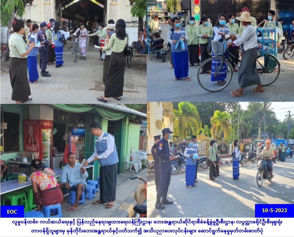 လူမှုဝန်ထမ်း၊ ကယ်ဆယ်ရေးနှင့် ပြန်လည်နေရာချထားရေးဝန်ကြီးဌာန၊ ဘေးအန္တရာယ်ဆိုင်ရာစီမံခန့်ခွဲမှု ဦးစီးဌာန၊ လပွတ္တာခရိုင်ဦးစီးမှူးရုံံးမှ တာဝန်ရှိသူများသည် (၁၀-၅-၂၀၂၃) ရက်နေ့တွင် အထွေထွေအုပ်ချုပ်ရေး ဦးစီးဌာန၊ မီသတ်ဦးစီးဌာနတို့နှင့်ပူးပေါင်း၍ လပွတ္တာမြို့၊ သင်္ဘောဆိပ်များနှင့် လူစည်ကားရာနေရာများ တွင် မုန်တိုင်းဘေးအန္တရာယ်နှင့်ပတ်သက်၍ အသိပညာပေးခြင်း၊ လက်ကမ်းစာစောင်များဝေငှခြင်း၊ mask များ ဝေငှပေးခြင်းများ ပြုလုပ်ဆောင်ရွက်ခဲ့ပါကြောင်း သတင်းရရှိပါသည်။