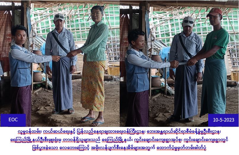 လူမှုဝန်ထမ်း၊ ကယ်ဆယ်ရေးနှင့် ပြန်လည်နေရာချထားရေးဝန်ကြီးဌာန၊ ဘေးအန္တရာယ်ဆိုင်ရာစီမံခန့်ခွဲမှုဦိးစီး ဌာန၊ ရေကြည်မြို့နယ်ဦးစီးမှူးရုံးမှ တာဝန်ရှိသူများသည် (၁၀-၅-၂၀၂၃)ရက်နေ့ (၁၉း၄၀)နာရီအချိန်၌ ရေကြည်မြို့နယ်၊ ကွင်းချောင်းကျေးရွာအုပ်စု၊ ကွင်းချောင်းကျေးရွာတွင် ဖြစ်ပွားခဲ့သော လေဘေးကြောင့် အမိုးလန်ပျက်စီးနေအိမ် (၃)လုံးအတွက် အိမ်ဆောက်ပစ္စည်းဖိုး(၄၅၀၀၀/-)၊ အိမ်ထောင်စု(၃) စုမှစုစုပေါင်း လူဦးရေ(၁၂)ဦးအတွက်(၇)ရက်စာဆန်ရိက္ခာရန်ပုံငွေ( ၂၅၂၀၀/-)၊ စုစုပေါင်းကယ်ဆယ်ရေးရန်ပုံငွေ(၇၀၂၀၀/-) အား (၁၁-၅-၂၀၂၃) ရက်နေ့ (၁၄း၀၀) နာရီအချိန်တွင် တာဝန်ရှိသူများရှေ့မှောက်၌ ဘေးသင့်ပြည်သူများ လက်ဝယ်အရောက်ထောက်ပံ့ပေးအပ်ခဲ့ပါကြောင်း သတင်းရရှိပါသည်။