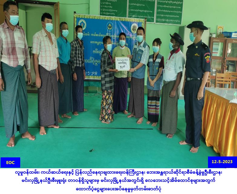 လူမှုဝန်ထမ်း၊ ကယ်ဆယ်ရေးနှင့် ပြန်လည်နေရာချထားရေးဝန်ကြီးဌာန၊ ဘေးအန္တရာယ်ဆိုင်ရာစီမံ ခန့်ခွဲမှုဦးစီးဌာန၊ ပဲခူးတိုင်းဒေသကြီး၊ သာယာဝတီခရိုင်၊ မင်းလှမြို့နယ်ဦးစီးမှူးရုံးမှ တာဝန်ရှိသူများသည် မင်းလှမြို့နယ်၊ ခွက်မကျေးရွာအုပ်စု၊ ခွက်မကျေးရွာ၌ (၁၁-၅-၂၀၂၃)ရက်နေ့(၁၇း၃၅)အချိန်တွင် ဖြစ်ပွား ခဲ့သော လေဘေးကြောင့် အမိုးလန်ပျက်စီးလူနေအိမ် (၁)လုံး၊ အိမ်ထောင်စု(၁)စုမှ လူဦးရေ(၂)ဦးနှင့် မင်းလှမြို့နယ်၊ ရှားတောကွင်းကျေးရွာအုပ်စု၊ တူးမြောင်းအောက်စုကျေးရွာ၌ (၁၂-၅-၂၀၂၃) ရက်နေ့ (၀၉း၄၅)အချိန်တွင် ဖြစ်ပွားသောလေဘေးကြောင့် အမိုးလန်ပျက်စီးလူနေအိမ် (၁)လုံး၊ အိမ်ထောင်စု (၁)စုမှ လူဦးရေ (၃)ဦးတို့အတွက် အိမ်ဆောက်ပစ္စည်းဖိုးထောက်ပံ့ငွေ (၁၀၀,၀၀၀/-)ကျပ်၊ အိမ်ထောင်စု (၂)စုမှ လူဦးရေ (၅)ဦးအတွက် ဆန်ရိက္ခာ(၇)ရက်စာဖိုးထောက်ပံ့ငွေ(၁၀,၅၀၀/-)ကျပ်၊ စုစုပေါင်း ထောက်ပံ့ငွေ (၁၁၀,၅၀ဝ/-)ကျပ်တို့အား (၁၂-၅-၂၀၂၃)ရက်နေ့၊ (၁၃:၀၀) နာရီအချိန်တွင် မင်းလှမြို့နယ် အထွေထွေအုပ်ချုပ်ရေးဦးစီးဌာနအစည်းအဝေးခန်းမ၌ မြို့နယ်မှတာဝန်ရှိသူများနှင့်အတူ ဘေးသင့် ပြည်သူများ လက်ဝယ်အရောက် ထောက်ပံ့ပေးအပ်ခဲ့ကြောင်း သတင်းရရှိပါသည်။