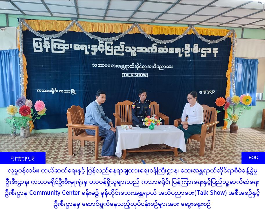 လူမှုဝန်ထမ်း၊ ကယ်ဆယ်ရေးနှင့် ပြန်လည်နေရာချထားရေးဝန်ကြီးဌာန၊ ဘေးအန္တရာယ်ဆိုင်ရာစီမံခန့်ခွဲမှုဦးစီးဌာန၊ ကသာခရိုင်ဦးစီးမှူးရုံးမှ တာဝန်ရှိသူများသည် မီးသတ်ဦးစီးဌာန၊ ပြန်ကြားရေးနှင့် ပြည်သူ့ဆက်ဆံရေးဦးစီးဌာနတို့နှင့်ပူးပေါင်း၍ (၁၂-၅-၂၀၂၃) ရက်နေ့၊ နံနက် (၁၀:၀၀) နာရီအချိန်တွင် ပြန်ကြားရေးနှင့်ပြည်သူ့ဆက်ဆံရေးဦးစီးဌာန Community Center ခန်းမ၌ မုန်တိုင်းဘေးအန္တရာယ်အသိပညာပေး(Talk Show) အစီအစဉ်နှင့် ဦးစီးဌာနမှ ဆောင်ရွက်နေသည့်လုပ်ငန်းစဉ်များအား ဆွေးနွေးဆောင်ရွက်ခဲ့ကြောင်း သတင်းရရှိပါသည်။