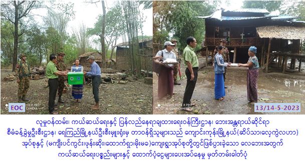 လူမှုဝန်ထမ်း၊ ကယ်ဆယ်ရေးနှင့် ပြန်လည်နေရာချထားရေးဝန်ကြီးဌာန၊ ဘေးအန္တရာယ်ဆိုင်ရာ စီမံခန့်ခွဲမှုဦးစီးဌာန၊ရေကြည်မြို့နယ်ဦးစီးမှူးရုံးမှတာဝန်ရှိသူများသည် ကျောင်းကုန်းမြို့နယ် (ဆိပ်သာ၊လှေကွဲလဟာ)အုပ်စု၌ (၁၃-၅-၂၀၂၃)ရက်နေ့တွင် ဖြစ်ပွားခဲ့သော လေဘေးကြောင့် ပြို ကျနေအိမ်(၁) လုံးနှင့် အမိုးလန်နေအိမ်(၁)လုံးတို့အတွက် အိမ်ဆောက် ပစ္စည်းဖိုး(၁၂၀,၀၀ဝ/-) အိမ်ထောင်စု(၂)စုမှ လူဦးရေ(၃) ဦးအတွက်ဆန်ရိက္ခာ(၇)ရက်စာ ရန်ပုံငွေ(၆,၃၀ဝ/-) စုစုပေါင်း ကယ်ဆယ်ရေးရန်ပုံငွေကျပ်(၁၂၆,၃၀၀/)နှင့် ကယ်ဆယ်ရေးပစ္စည်း(၁၇)မျိုးပါ (၁) ပုံးနှင့် ကျောင်း ကုန်းမြို့နယ်(မကျီးပင်ကွင်း၊ဖုန်းဆိုး၊ထောက်ရှာ.၊မိုးမခ)ကျေးရွာအုပ်စုတို့၌ (၁၄-၅-၂၀၂၃) ရက်နေ့တွင် ဖြစ်ပွားခဲ့သော လေဘေးကြောင့် ပြိုကျနေအိမ်(၃)လုံး၊ အမိုးလန်နေအိမ်( ၄) လုံး တို့အတွက် အိမ်ဆောက်ပစ္စည်းဖိုး( ၃၈၀,၀၀ဝ/-)အိမ်ထောင်စု (၇)စုမှ လူဦးရေ( ၁၉)ဦး အတွက် ဆန်ရိက္ခာ(၇)ရက်စာရန်ပုံငွေ (၃၉၉၀ဝ/-).စုစုပေါင်းကယ်ဆယ်ရေးရန်ပုံငွေ (၄၁၉,၉၀ဝ/-) နှင့် ကယ်ဆယ်ရေးပစ္စည်း (၁၇)မျိုးပါ အိမ်ထောင်စု(၃)စုစာတို့အား ( ၁၄-၅-၂၀၂၃)ရက်နေ့ (၁၄း၂၀) နာရီအချိန်တွင် တာဝန်ရှိသူများရှေ့မှောက်၌ ဘေးသင့်ပြည်သူများ လက်ဝယ်အရောက် ထောက်ပံ့ပေးအပ်ခဲ့ပါကြောင်း သတင်းရရှိပါသည်။