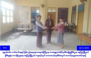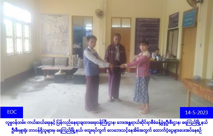 လူမှုဝန်ထမ်း၊ ကယ်ဆယ်ရေးနှင့် ပြန်လည်နေရာချထားရေးဝန်ကြီးဌာန၊ ဘေးအန္တရာယ်ဆိုင်ရာစီမံ ခန့်ခွဲမှုဦးစီးဌာန၊ ရေကြည်မြို့နယ်ဦးစီးမှူးရုံးမှတာဝန်ရှိသူများသည် ရေကြည်မြို့နယ်၊ ဗထူးရပ်ကွက်၌ (၁၄-၅-၂၀၂၃) ရက်နေ့တွင်ဖြစ်ပွားခဲ့သော လေဘေးကြောင့် အမိုးလန်ပျက်စီးအိမ်ခြေ (၁)လုံးအတွက် အိမ်ဆောက်ပစ္စည်းဖိုးငွေ (၃၀,၀၀ဝ/-)၊ လူဦးရေ(၄)ဦးအတွက် ဆန်ရိက္ခာ(၇)ရက်စာရန်ပုံငွေ(၈,၄၀ဝ/-)စုစုပေါင်းကယ်ဆယ်ရေးရန်ပုံငွေကျပ် (၃၈,၄၀၀/)ကျပ်တို့အား ( ၁၄-၅-၂၀၂၃)ရက်နေ၊ (၁၄း၀၀)နာရီ အချိန်တွင် တာဝန်ရှိသူများရှေ့မှောက်၌ ဘေးသင့်ပြည်သူများ လက်ဝယ်အရောက် ထောက်ပံ့ပေးအပ်ခဲ့ ပါကြောင်း သတင်းရရှိပါသည်။