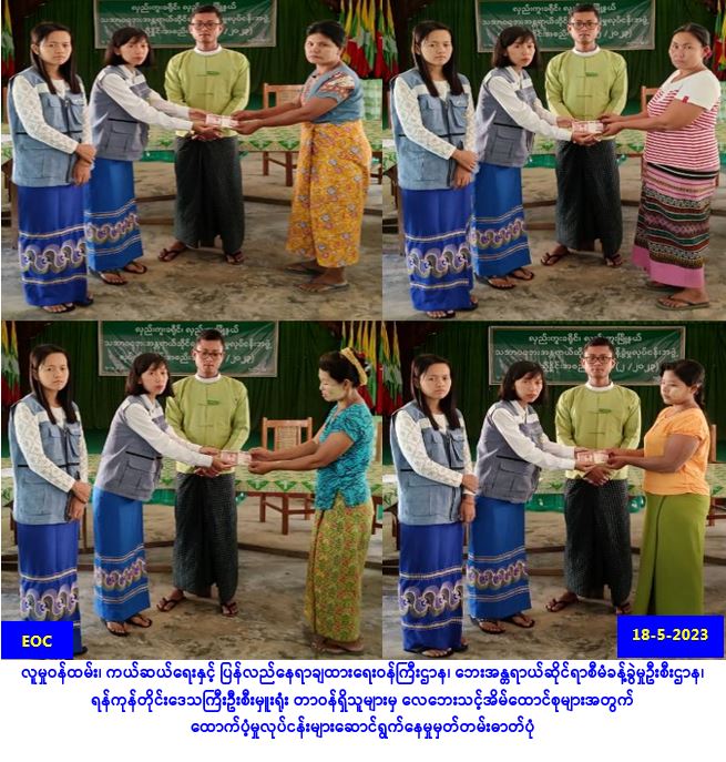 လူမှုဝန်ထမ်း၊ ကယ်ဆယ်ရေးနှင့် ပြန်လည်နေရာချထားရေးဝန်ကြီးဌာန၊ ဘေးအန္တရာယ်ဆိုင်ရာစီမံခန့်ခွဲမှု ဦးစီးဌာန၊ ရန်ကုန်တိုင်းဒေသကြီးဦးစီးမှူးရုံးမှ တာဝန်ရှိသူများသည် ရန်ကုန်တိုင်းဒေသကြီး၊ လှည်းကူးခရိုင်၊ လှည်းကူးမြို့နယ်၊ သာယာကုန်းကျေးရွာအုပ်စု၊ သာယာကုန်းကျေးရွာ၊ ဘုရားသုံးဆူရပ်ကွက်၌ (၁၄-၅-၂၀၂၃)ရက်နေ့တွင် မိုးသည်းထန်စွာရွာသွန်း၍ လေပြင်းတိုက်ခတ်မှုကြောင့် တစ်စိတ်တစ်ပိုင်းပျက်စီး အိမ်ခြေ (၃)လုံး၊ အိမ်ထောင်စု(၃)စုမှ လူဦးရေ(၉) ဦးနှင့် သနပ်ပြင်ကျေးရွာအုပ်စု၊ ဇရပ်ကွင်းကျေးရွာအုပ်စု၊ မလစ်အနောက်ကျေးရွာအုပ်စု၊ သူငယ့်ချောင်ကျေးရွာအုပ်စု၊ စိုင်ဒီကုန်းကျေးရွာအုပ်စုနှင့် ဖောင်ကြီးအရှေ့ ကျေးရွာအုပ်စုတို့၌ (၁၄-၅-၂၀၂၃)ရက်နေ့တွင် မိုးသည်းထန်စွာရွာသွန်း၍ လေပြင်းတိုက်ခတ်မှုကြောင့် လုံးဝ ပျက်စီးအိမ်ခြေ (၁)လုံး၊ တစ်စိတ်တစ်ပိုင်းပျက်စီးအိမ်ခြေ (၁၃)လုံး၊ အိမ်ထောင်စု (၁၄)စုမှ လူဦးရေ (၆၅)ဦး၊ စုစုပေါင်းဘေးသင့်အိမ်ခြေ (၁၇)လုံး၊ စုစုပေါင်းဘေးသင့်အိမ်ထောင်စု (၁၇)စုနှင့် စုစုပေါင်း ဘေးသင့် လူဦးရေ (၇၄)ဦးတို့အတွက် ဆန်ရိက္ခာ (၇)ရက်စာဖိုးထောက်ပံ့ငွေကျပ် (၁၅၅,၄၀ဝ/-)၊ အိမ်ခြေ (၁)လုံး အတွက် အိမ်ဆောက်ပစ္စည်းဖိုးထောက်ပံ့ငွေကျပ် (၁၀၀,၀ဝဝ/-)၊ တစ်စိတ်တစ်ပိုင်းပျက်စီးအိမ်ခြေ (၁၆)လုံး အတွက် အိမ်ဆောက်ပစ္စည်းဖိုးထောက်ပံ့ငွေကျပ် (၈၀၀,၀ဝဝ/-)၊ စုစုပေါင်းဘေးသင့်အိမ်ခြေ (၁၇)လုံး အတွက် အိမ်ဆောက်ပစ္စည်းဖိုးထောက်ပံ့ငွေကျပ် (၉၀၀,၀ဝဝ/-)၊ စုစုပေါင်း ထောက်ပံ့ငွေကျပ် (၁,၀၅၅,၄၀ဝ/-) နှင့် ကယ်ဆယ်ရေးပစ္စည်း (၁၆)မျိုး (၁)အိမ်ထောင်စုစာတို့အား (၁၈-၅-၂၀၂၃) ရက်နေ့၊ (၁၄:၀၀)နာရီအချိန်တွင် တိုက်ကြီးမြို့နယ်အထွေထွေအုပ်ချုပ်ရေးဦးစီးဌာနမှ တာဝန်ရှိသူများနှင့်အတူ ပြည်သူများ၏ လက်ဝယ်အရောက်ထောက်ပံ့ပေးအပ်ခဲ့ကြောင်း သတင်းရရှိပါသည်။