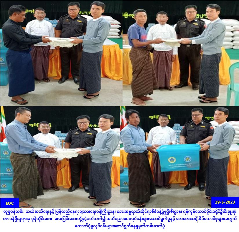 လူမှုဝန်ထမ်း၊ ကယ်ဆယ်ရေးနှင့် ပြန်လည်နေရာချထားရေးဝန်ကြီးဌာန၊ ဘေးအန္တရာယ်ဆိုင်ရာစီမံခန့်ခွဲမှု ဦးစီးဌာန၊ ရန်ကုန်တောင်ပိုင်းခရိုင်ဦးစီးမှူးရုံးမှ တာဝန်ရှိသူများသည် (၁၉-၅-၂၀၂၃) ရက်နေ့၊ နံနက် (၁၁း၀၀) နာရီအချိန်တွင် တွံတေးခရိုင်၊ ကွမ်းခြံကုန်းမြို့နယ် အထွေထွေအုပ်ချုပ်ရေးဦးစီးမှူးရုံးခန်းမ၌ မိမိတို့ဦးစီးဌာန၏ လုပ်ငန်းဆောင်ရွက်ချက်များအား ပြည်သူများသိရှိနိုင်စေရန် ရှင်းလင်းပြောကြားခြင်းနှင့် မုန်တိုင်ဘေး၊ လေပြင်းဘေးတို့နှင့်ပတ်သက်၍ ကြိုတင်ပြင်ဆင်ရမည့်အချက်များ၊ ဆောင်ရန် ရှောင်ရန် အချက်များဆွေးနွေးဟောပြောခြင်းများဆောင်ရွက်ခဲ့ပြီး တွံတေးခရိုင်၊ ကွမ်းခြံကုန်းမြို့နယ်၊ အင်္ဂလုံး ကျေးရွာအုပ်စု၊ မရမ်းကျေးရွာအုပ်စု၊ တော်ခရမ်းလေးကျေးရွာအုပ်စုနှင့် တော်ခရမ်းအနောက်ကျေးရွာ အုပ်စုတို့၌ (၁၄-၅-၂၀၂၃) ရက်နေ့တွင် ဖြစ်ပွားခဲ့သော လေပြင်းတိုက်ခတ်မှုကြောင့် ပြောင်းရွေ့နေထိုင်သူ အိမ်ထောင်စု (၃၂၃) စု၊ လူဦးရေ (၈၀၈)ဦး၊ ပြိုကျပျက်စီးနေအိမ် (၃)လုံး၊ အမိုးလန်ပျက်စီးနေအိမ် (၅)လုံး ၊ စုစုပေါင်း နေအိမ်(၈)လုံး၊ အိမ်ထောင်စု (၈)စု၊ လူဦးရေ (၃၃)ဦးတို့အတွက် အိမ်ဆောက်ပစ္စည်းဖိုးထောက်ပံ့ငွေ ( ၅၁၅,၀၀ဝ/ )၊ ဆန်ရိက္ခာဖိုးထောက်ပံ့ငွေ (၁,၇၆၆,၁၀ဝ/ )၊ စုစုပေါင်းထောက်ပံငွေ (၂,၂၈၁,၁၀ဝ/-)ကျပ်နှင့်၊ ကယ်ဆယ်ရေးပစ္စည်း (၁၇)မျိုး အိမ်ထောင်စု(၃)စုစာ၊ ပစ္စည်းတန်ဖိုး(၁၃၉,၀၉၂/)နှင့် ကိုဗစ်တီရှပ် (၆) ထည်တို့အား (၁၉-၅-၂၀၂၃)ရက်နေ့၊ (၁၂း၀၀)နာရီအချိန်တွင် ပြည်သူများ၏ လက်ဝယ်အရောက် သွားရောက်ထောက်ပံ့ပေးအပ်ခဲ့ကြောင်း သတင်းရရှိပါသည်။