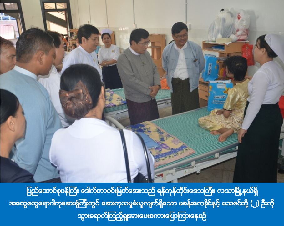 ပြည်သူတို့၏ လူမှုဘဝလုံခြုံဖွံ့ဖြိုးရေးအတွက် ဝန်ကြီးဌာနအနေဖြင့် လူမှုကာကွယ်စောင့်ရှောက်ရေး လုပ်ငန်းများကို တိုးမြှင့်ဆောင်ရွက်လုပ်ဆောင်လျက်ရှိရာ လူမှုဝန်ထမ်း၊ ကယ်ဆယ်ရေးနှင့် ပြန်လည်နေရာချထားရေးဝန်ကြီးဌာန၊ ပြည်ထောင်စုဝန်ကြီး ဒေါက်တာဝင်းမြတ်အေးသည် ၂၀၁၆ ခုနှစ်၊ နိုဝင်ဘာလ (၁) ရက်နေ့ နံနက်ပိုင်းတွင် ရန်ကုန်တိုင်းဒေသကြီး၊ လသာမြို့နယ်ရှိ အထွေထွေရောဂါကုဆေးရုံကြီးတွင် ဆေးကုသမှုခံယူလျက်ရှိသော မစန်းကေခိုင်နှင့် မသဇင်တို့ (၂) ဦးကို သွားရောက်ကြည့်ရှုအားပေးစကားပြောကြားခဲ့ပါသည်။ ပြည်ထောင်စုဝန်ကြီးနှင့်အဖွဲ့ကို ခွဲစိတ်အထူးကုဆရာဝန်ကြီး ပါမောက္ခဒေါက်တာခင်မောင်မြင့်က လူနာ (၂) ဦးနှင့်ပတ်သက်၍ ခွဲစိတ်ကုသပြီးအခြေအနေများကို ရှင်းလင်းတင်ပြခဲ့ပါသည်။
