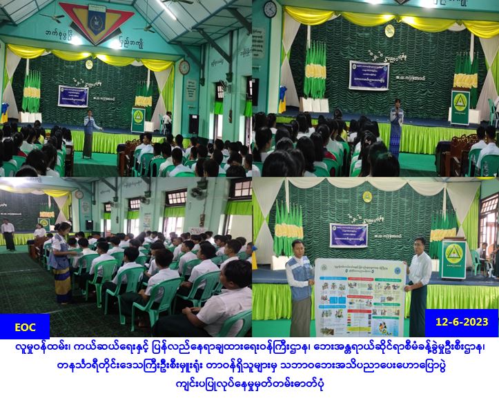 လူမှုဝန်ထမ်း၊ ကယ်ဆယ်ရေးနှင့် ပြန်လည်နေရာချထားရေးဝန်ကြီးဌာန၊ ဘေးအန္တရာယ်ဆိုင်ရာစီမံခန့်ခွဲမှုဦးစီးဌာန၊ တနင်္သာရီတိုင်းဒေသကြီးဦးစီးမှူးရုံးမှ တာဝန်ရှိသူများသည် (၁၂-၆-၂၀၂၃)ရက်နေ့၊ (၁၃:၀၀)နာရီအချိန်တွင် ထားဝယ်ခရိုင်၊ ထားဝယ်မြို့နယ်၊ အ.ထ.က(၃) အခြေခံပညာအထက်တန်းကျောင်းတွင် ကျောင်းသား/သူ (၂၀၀)ဦး ခန့်အား သဘာဝဘေးအန္တရာယ်များနှင့်ပတ်သက်၍ အသိပညာပေးဟောပြောခြင်း၊ လက်ကမ်းစာစောင်များဝေငှ ပေးခြင်းနှင့် ဗွီနိုင်းပိုစတာဖြန့်ဝေပေးခြင်းများ ဆောင်ရွက်ခဲ့ပါကြောင်း သတင်းရရှိပါသည်။