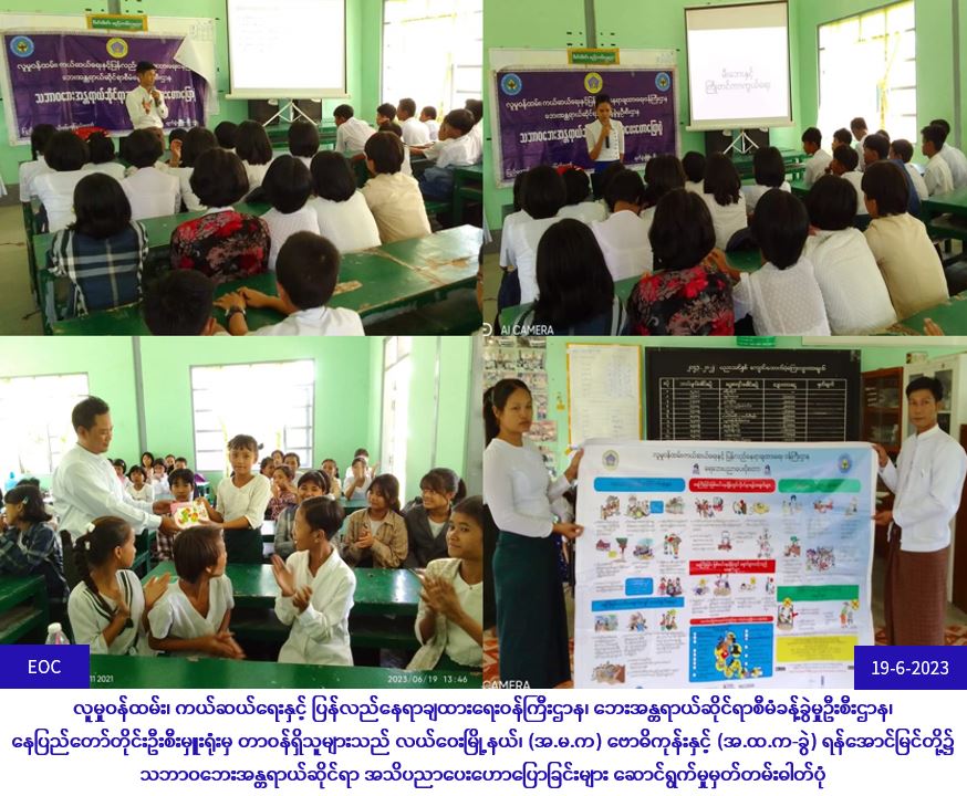 လူမှုဝန်ထမ်း၊ ကယ်ဆယ်ရေးနှင့် ပြန်လည်နေရာချထားရေးဝန်ကြီးဌာန၊ ဘေးအန္တရာယ်ဆိုင်ရာစီမံခန့်ခွဲမှုဦးစီး ဌာန၊ နေပြည်တော်တိုင်းဦးစီးမှူးရုံးမှ တာဝန်ရှိသူများသည် (၁၉-၆-၂၀၂၃)ရက်နေ့၊ (၀၉း၃၀)အချိန်မှ (၁၂း၀၀) အချိန်အထိ လယ်ဝေးမြို့နယ်၊ (အ.မ.က)ဗောဓိကုန်းစာသင်ကျောင်း၌ ကျောင်းသား/သူ(၁၁၀)ဦးနှင့် (အ.ထ.က.ခွဲ) ရန်အောင်မြင် စာသင်ကျောင်း၌ (၁၃း၀၀)အချိန်မှ(၁၅း၀၀)အချိန်ထိ၊ ကျောင်းသား/သူ(၁၅၀)ဦး စုစုပေါင်း ကျောင်းသား/သူ(၂၆၀)ဦးတို့အား သဘာဝဘေးအန္တရာယ်များနှင့်ပတ်သက်၍ ဆောင်ရန်/ ရှောင်ရန် အချက်များအား သိရှိလိုက်နာဆောင်ရွက်နိုင်ရေးအတွက် သဘာဝဘေးအသိပညာပေးဟောပြောပွဲကို ကျင်းပပြု လုပ်ခဲ့ပါကြောင်း သတင်းရရှိပါသည်။