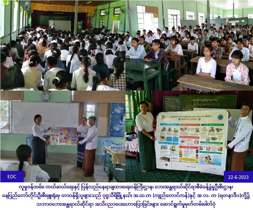 လူမှုဝန်ထမ်း၊ ကယ်ဆယ်ရေးနှင့် ပြန်လည်နေရာချထားရေးဝန်ကြီးဌာန၊ ဘေးအန္တရာယ်ဆိုင်ရာစီမံခန့်ခွဲမှုဦးစီးဌာန၊ ပြည်ထောင်စုနယ်မြေ၊ နေပြည်တော်တိုင်းဦးစီးမှူးရုံးမှ တာဝန်ရှိသူများနှင့် ဥတ္တရခရိုင်ဦးစီးမှူးရုံးမှ တာဝန်ရှိသူများသည် (၂၂-၆-၂၀၂၃) ရက်နေ့ (၀၉း၃၀) အချိန်မှ (၁၁း၀၀) အချိန်ထိ ပုဗ္ဗသီရိမြို့နယ်၊ အ.ထ.က (ကျည်တောင်ကန်)စာသင်ကျောင်း၌ ကျောင်းသား/ သူ (၂၀၀) ဦး၊ (၁၃း၀၀) အချိန်မှ (၁၄း၃၀) အချိန်ထိ အ လ. က (ရတနာဒီပ)စာသင်ကျောင်းတွင် ကျောင်းသား/ သူ (၁၀၀) ဦး၊ စုစုပေါင်း ကျောင်းသား/သူ (၃၀၀)ဦးတို့အား သဘာဝဘေးအန္တရာယ်များနှင့်ပတ်သတ်၍ ဆောင်ရန်/ ရှောင်ရန်အချက်များအား သိရှိလိုက်နာဆောင်ရွက်နိုင်ရေးအတွက် သဘာဝဘေးအသိပညာပေးဟောပြောပွဲကို ကျင်းပပြုလုပ်ခဲ့ပါကြောင်း သတင်းရရှိပါသည်။