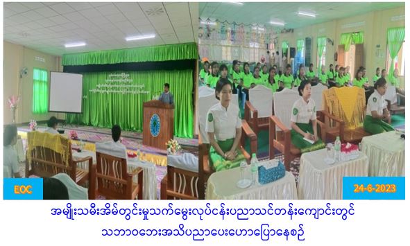 လူမှုဝန်ထမ်း၊ ကယ်ဆယ်ရေးနှင့်ပြန်လည်နေရာချထားရေးဝန်ကြီးဌာန၊ ဘေးအန္တရာယ်ဆိုင်ရာစီမံခန့်ခွဲမှုဦးစီးဌာန၊မြိတ်ခရိုင်ဦးစီးမှူးရုံးမှ တာဝန်ရှိသူများသည် (၂၄.၆.၂၀၂၂) ရက်နေ့တွင်နယ်စပ်ရေးရာဝန်ကြီးဌာန၊ပညာရေးနှင့်လေ့ကျင့်ရေးဦးစီးဌာန၊အမျိုးသမီးအိမ်တွင်းမှုသက်မွေးလုပ်ငန်းပညာသင်တန်းကျောင်းတွင်သဘာဝဘေးအသိပညာပေးဟောပြောခြင်း၊လက်ကမ်းစာစောင်များဖြန့်ဝေခြင်းများအား သွားရောက်ဆောင်ရွက်ခဲ့ကြောင်း သတင်းရရှိပါသည်။
