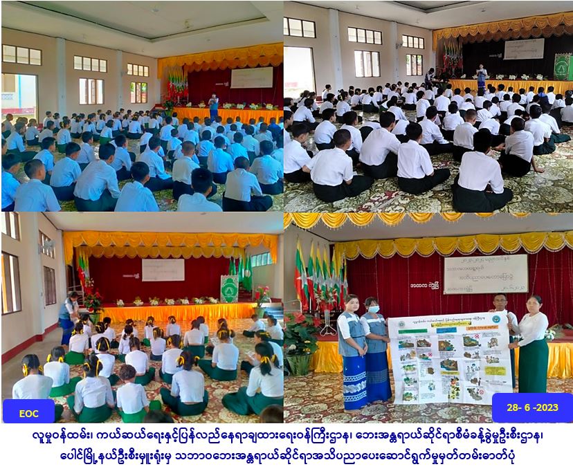 လူမှုဝန်ထမ်း၊ ကယ်ဆယ်ရေးနှင့်ပြန်လည်နေရာချထားရေးဝန်ကြီးဌာန၊ ဘေးအန္တရာယ်ဆိုင်ရာစီမံခန့်ခွဲမှု ဦးစီးဌာန၊ ပေါင်မြို့နယ် ဦးစီးမှူးရုံးမှ တာဝန်ရှိသူများသည် (၂၈-၆-၂၀၂၃)ရက်နေ့ (၁၀း၀၀)နာရီအချိန်မှ (၁၁း၃၀)နာရီအချိန်ထိ သဘာဝဘေးအန္တရာယ် ဆိုင်ရာအသိပညာပေးဟောပြောပွဲနှင့်ပတ်သက်၍ သိရှိ လိုက်နာဆောင်ရွက်ရမည့် ဆောင်ရန်/ရှောင်ရန်အချက်များအား ပေါင်မြို့နယ်၊ အ.ထ.က(ကျွဲခြံ) စာသင် ကျောင်း၌ ကျောင်းသား/သူ အင်အား (၁၀၀) ဦးတို့အား အသိပညာပေးဟောပြောဆွေးနွေးခြင်း၊ လက်ကမ်းစာစောင်များအားဖြန့်ဝေခြင်း၊ ဗီနိုင်ပိုစတာပေးအပ်ခြင်း၊ အအေးနှင့်မုန့်များဝေငှခြင်းများ ဆောင်ရွက်ခဲ့ပါကြောင်း သတင်းရရှိပါသည်။