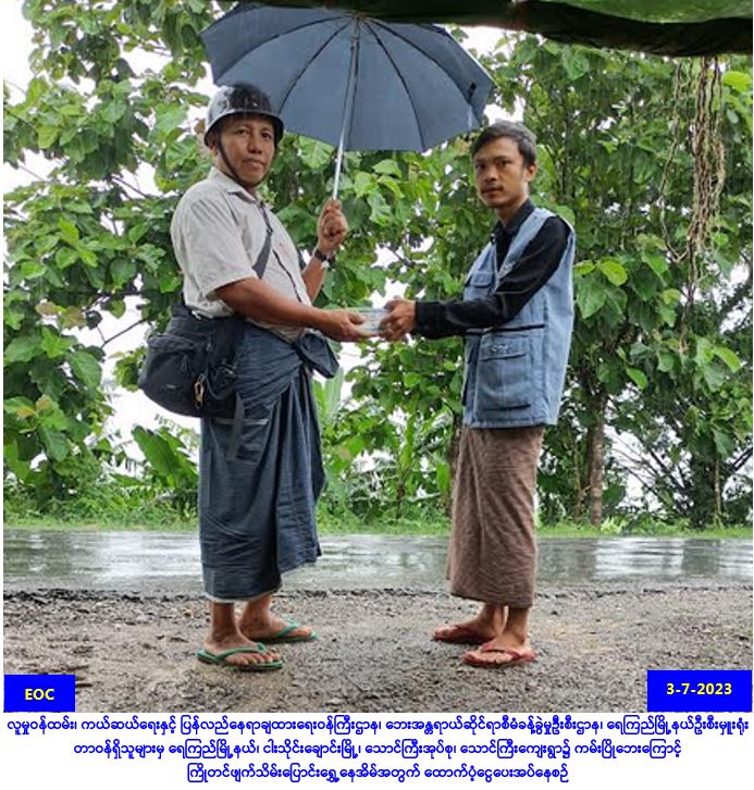 လူမှုဝန်ထမ်း၊ ကယ်ဆယ်ရေးနှင့် ပြန်လည်နေရာချထားရေးဝန်ကြီးဌာန၊ ဘေးအန္တရာယ်ဆိုင်ရာစီမံခန့်ခွဲမှု ဦးစီးဌာန၊ ရေကြည်မြို့နယ်ဦးစီးမှူးရုံးမှတာဝန်ရှိသူများသည် ရေကြည်မြို့နယ်၊ ငါးသိုင်းချောင်းမြို့၊ သောင်ကြီးအုပ်စု၊ သောင်ကြီးကျေးရွာ၌ (၃၀-၆-၂၀၂၃)ရက်နေ့တွင် ဖြစ်ပွားခဲ့သော ကမ်းပြိုဘေးကြောင့် ကြိုတင်ဖျက်သိမ်းပြောင်းရွှေ့ခဲ့ရသော အိမ်ခြေ (၁)လုံးအတွက် အိမ်ဆောက်ပစ္စည်းဖိုးထောက်ပံ့ငွေ (၁၀၀,၀၀ဝ/-)၊ အိမ်ထောင်စု(၁)စုမှ လူဦးရေ(၇)ဦးအတွက် ဆန်ရိက္ခာဖိုးငွေ (၇)ရက်စာ (၁၄,၇၀ဝ/-) စုစုပေါင်းထောက်ပံ့ငွေ (၁၁၄,၇၀၀/) ကျပ်တို့အား (၃-၇-၂၀၂၃)ရက်နေ့၊ (၁၄း၃၀) နာရီအချိန် တွင် တာဝန်ရှိသူများရှေ့မှောက်၌ ဘေးသင့်ပြည်သူများ လက်ဝယ်အရောက် ထောက်ပံ့ပေးအပ်ခဲ့ကြောင်း သတင်းရရှိပါသည်။